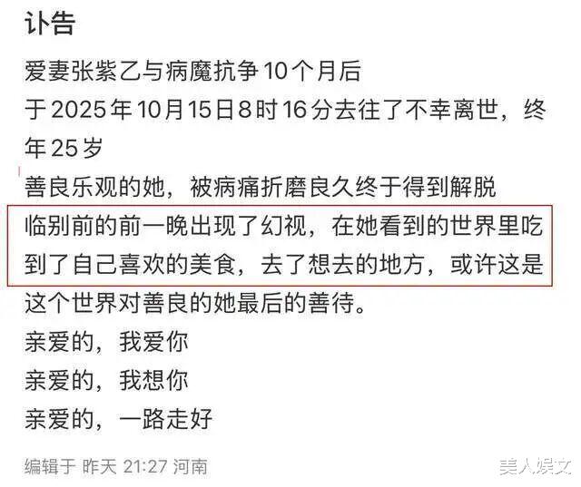 2025 年 10 月 15 日上午 8 点 16 分,河南 25 岁的张紫乙在与胃癌抗争 10 个月后溘然长逝。这个时间点有着令人心碎的巧合 —— 两年前的同一天,她刚与爱人举行婚礼,披上婚纱迎接人生新起点。直到生命最后一夜,陷入幻视的她还在 “品尝” 爱吃的美食,“游历” 向往的地方,这份对生活的眷恋更让旁观者扼腕叹息。