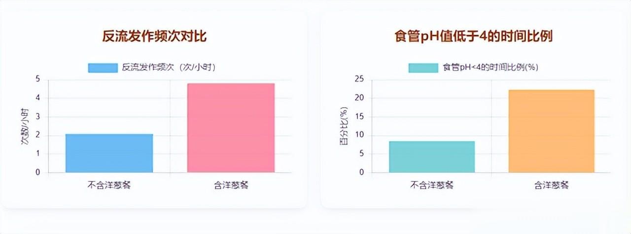 一项针对有胃食管反流症状者的小型研究发现,受试者在吃了含洋葱的一餐后 (相比不含洋葱),与胃酸反流和反酸相关的指标显著增加,包括反流发作频次、食管 pH 值低于 4 的时间比例显著上升,主观“烧心 、反酸 、嗳气 、打嗝”也明显更多。也就是说,对于本身有反流、胃酸过多、食管敏感的人,洋葱可能是一个加重刺激因子。