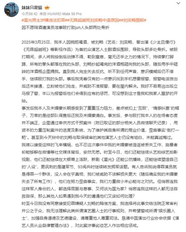 10月17日,一位网名为“妹妹只是猫”的网友,通过社交账号发文,爆料她因为不愿意陪酒,遭到了演员刘奕畅等演员酒后围殴。