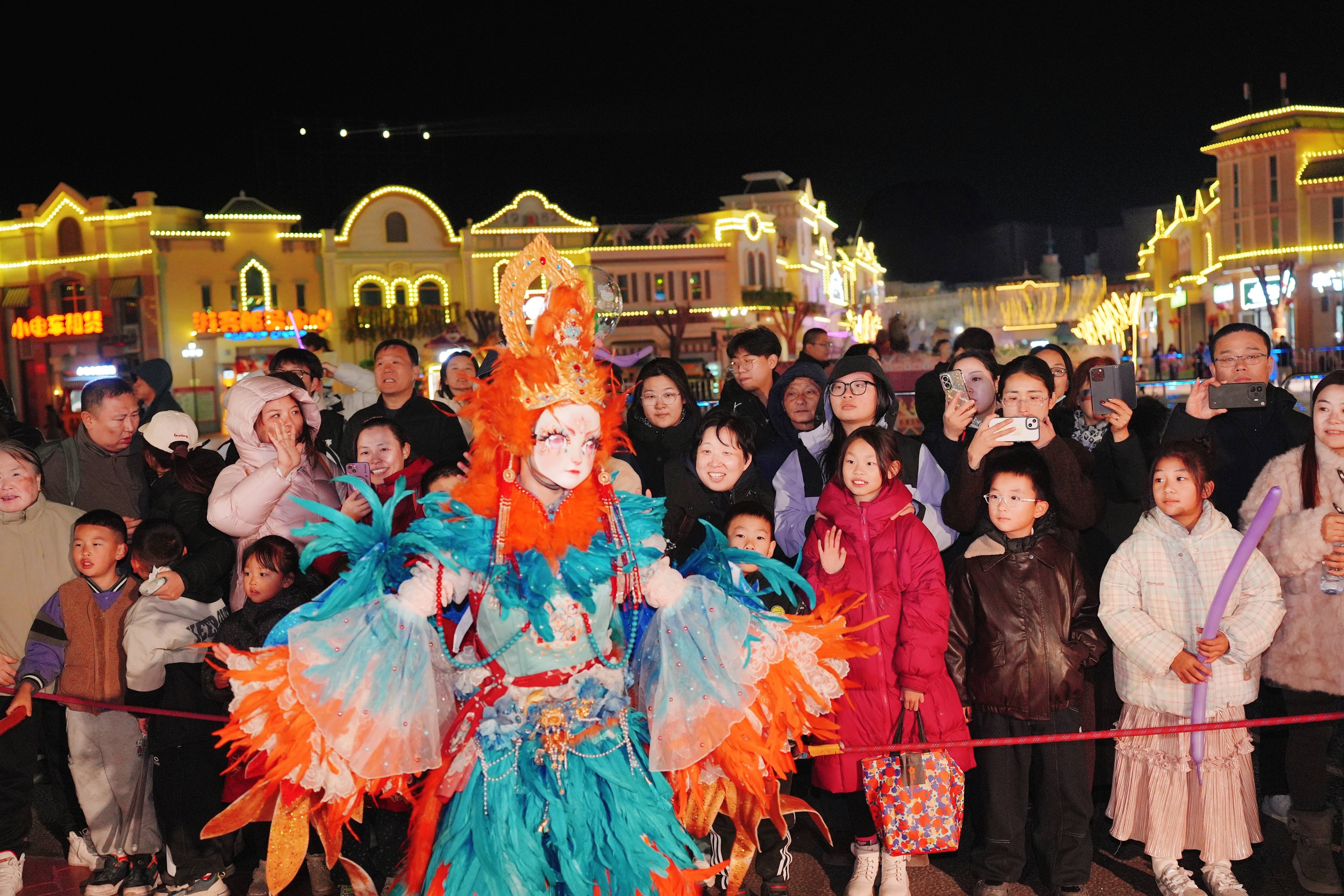 从早到晚,园区内演艺不断,为游客带来视觉与听觉的双重享受。非遗花荟热闹非凡,舞龙、舞狮、踩高跷等传统技艺轮番登场;奇幻的“山海聚仙录”与惊险的民俗杂技亦引得观众连连喝彩。萌趣十足的“熊出没新春狂欢秀”更是俘获了大批亲子家庭的喜爱。每晚7点,“福马奔腾大巡游”如约而至,璀璨花车缓缓行进,NPC热情互动,游客在巡游道路两侧随着音乐摇摆,在欢笑声中感受浓浓的新春氛围。
