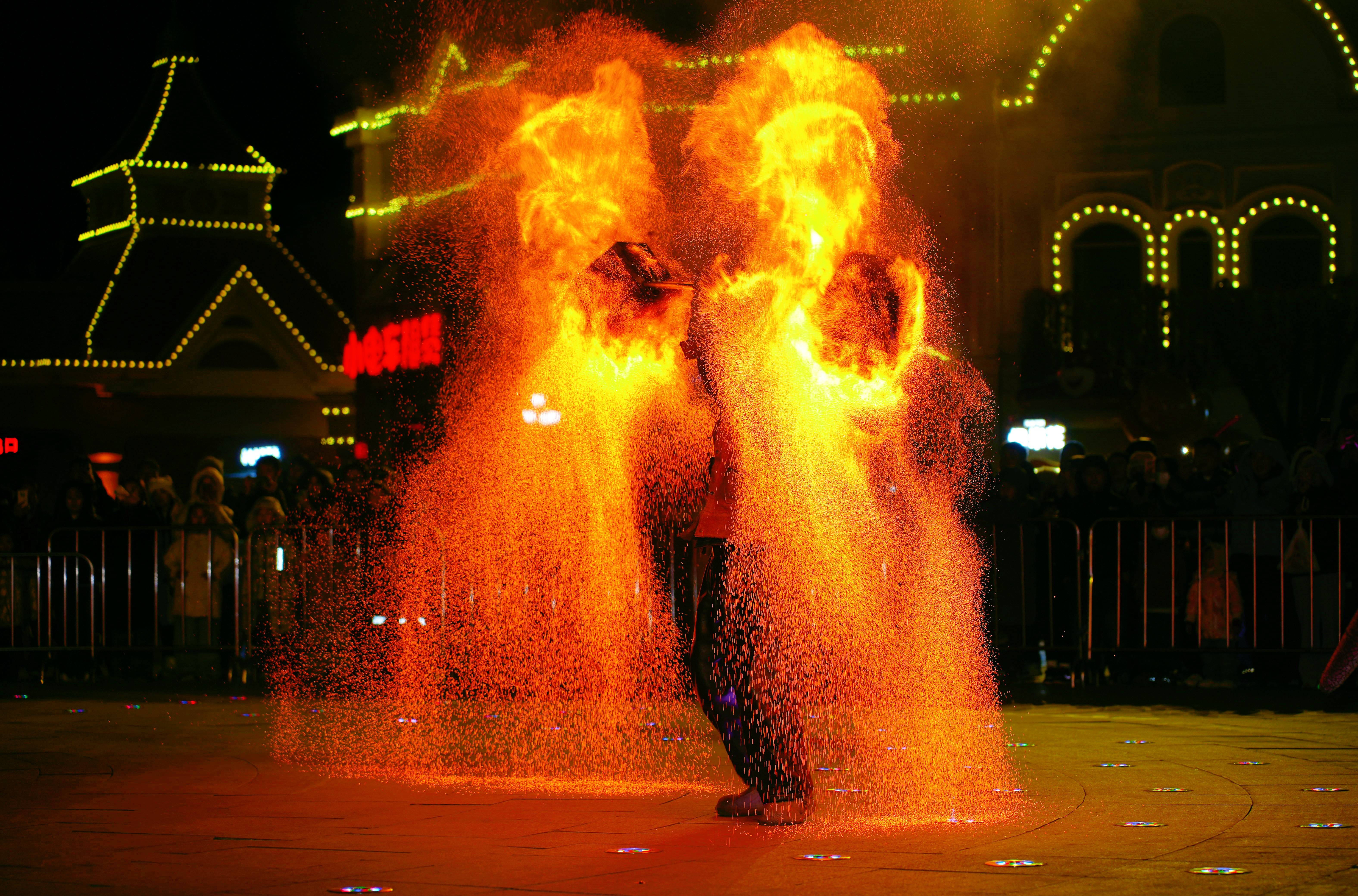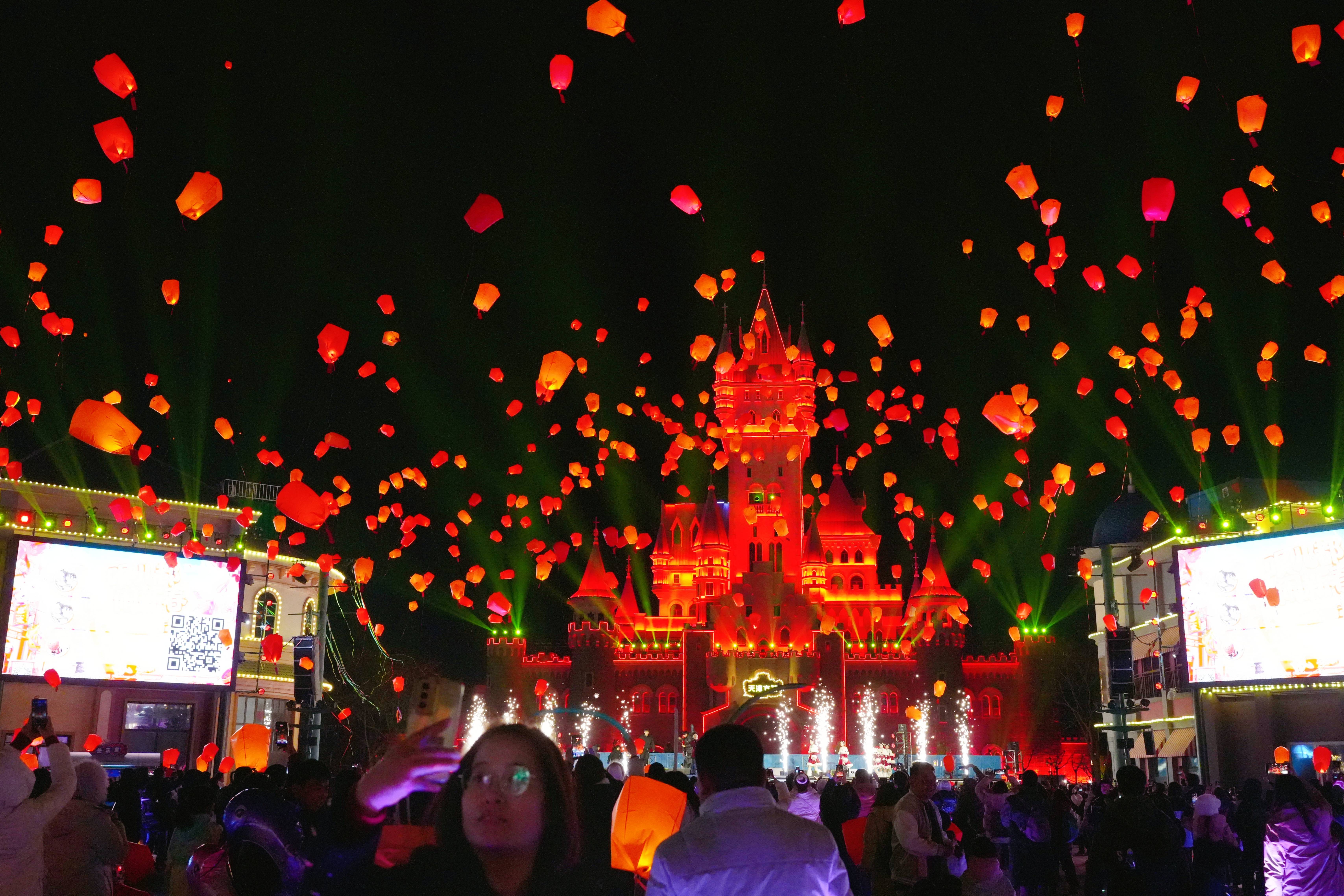 夜色渐深,园区灯光次第点亮,城堡灯光秀绚丽上演,将夜空装点得流光溢彩。随后,篝火晚会、打铁花等非遗表演依次展开。作为当晚最具仪式感的环节,“千灯祈愿”活动温情启动,众多游客齐聚喷泉广场,手持孔明灯,在夜色中默默许下新春愿望。随着一盏盏明灯缓缓升空,与天上星辰交相辉映,将现场节日氛围推向高潮。