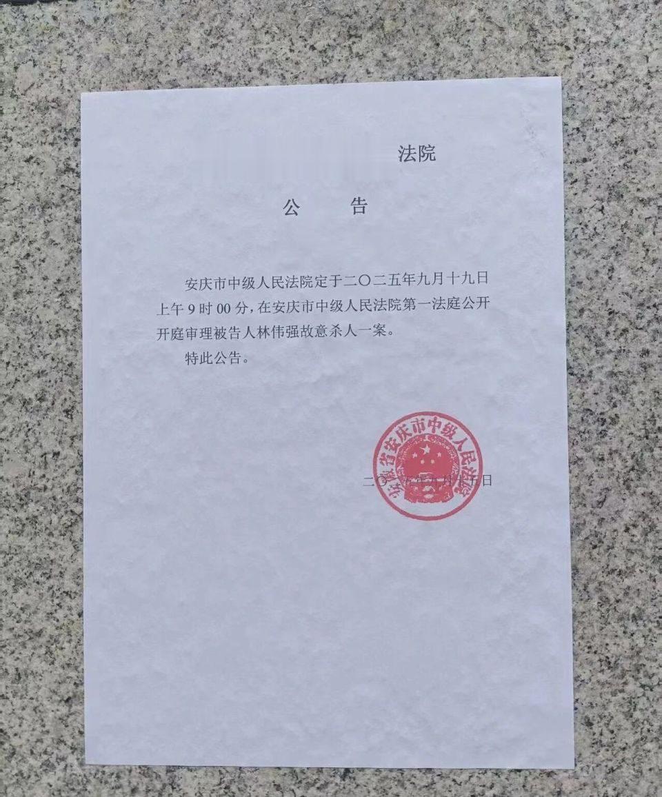 2025年9月19日,林伟强涉嫌故意杀人案在安庆市中级人民法院公开开庭审理。据林女士回忆,林伟强“长胖了,白白净净的,他只是抬头看着天花板说了一句‘对不起’,一点温度都没有”。更令她担忧的是,凶手在羁押期间仍威胁出狱后报复证人。