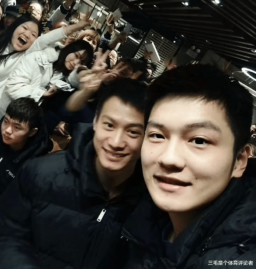 在这张照片上,一共有樊振东和周雨和宋旭3位八一男乒的球员。除此之外,再没有球员了,后面举着手机和欢呼的人们,都是来观看大家比赛的球迷们。