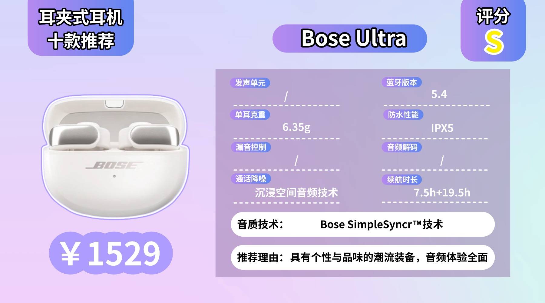 耳夹式耳机哪种好用,约 6.35g 的重量搭配柔软硅胶耳挂,佩戴贴耳稳固,不过耳挂面积较大,夏天或大运动量时可能稍微有点闷。音质由 Bose SimpleSyncr™ 技术以及骁龙畅听平台加持,声场层次感明显,空间感强;通话清晰,但大风环境会略受影响。续航方面单次约 7.5 小时,总续航接近 19.5 小时,日常通勤够用,但与同价位相比不算突出。整体适合预算高、喜欢沉浸式空间听感的人。