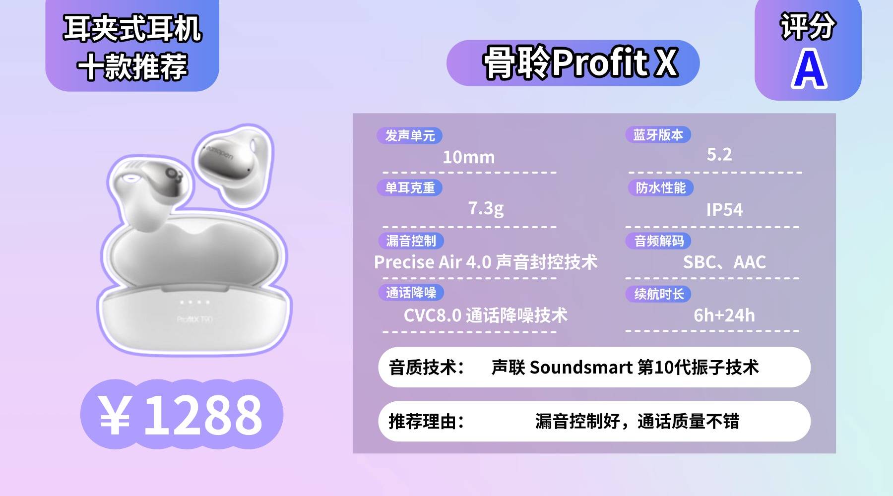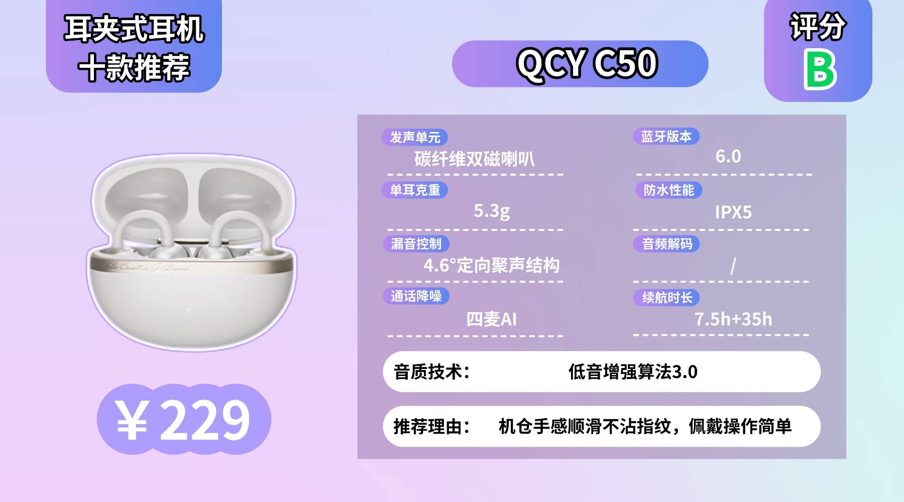 耳夹式耳机哪种好用,单耳约 7.3g,U 形夹耳设计带来不错的稳定度,跑步、走路都挺牢,只是整体体积偏大,耳朵较小的人需要一些适应时间。声音由第 10 代 Soundsmart 振子配合 10mm 动圈输出,细节清晰、低频量感足,但控制力一般,复杂曲目里会偶尔出现声音堆叠的情况。蓝牙 5.2 日常连接稳定,不过偶尔会出现轻微音画不同步。CVC8.0 通话降噪在室内效果好,户外风噪较多时会有明显干扰。