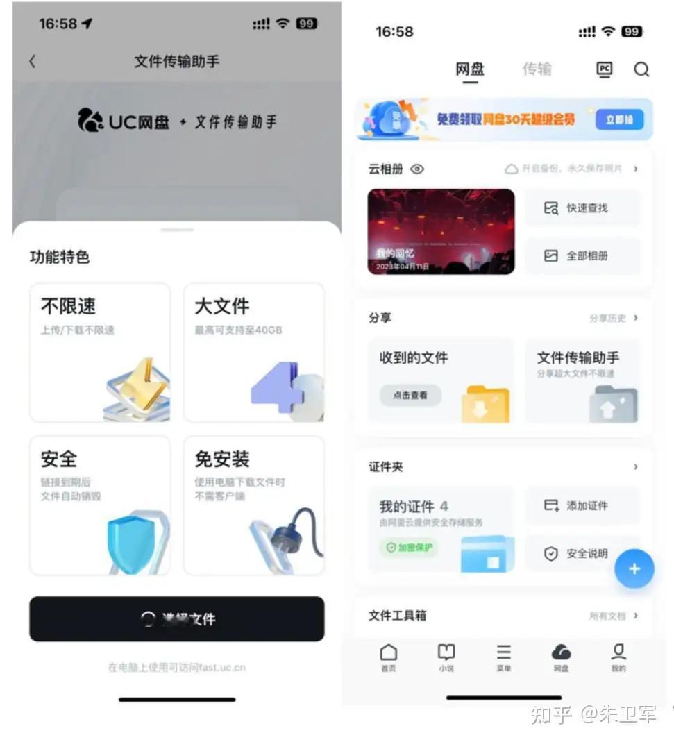 最最重要的一点是,UC网盘还有个文件传输助手功能,特别适用于给同事、客户、领导发大文件的场景。