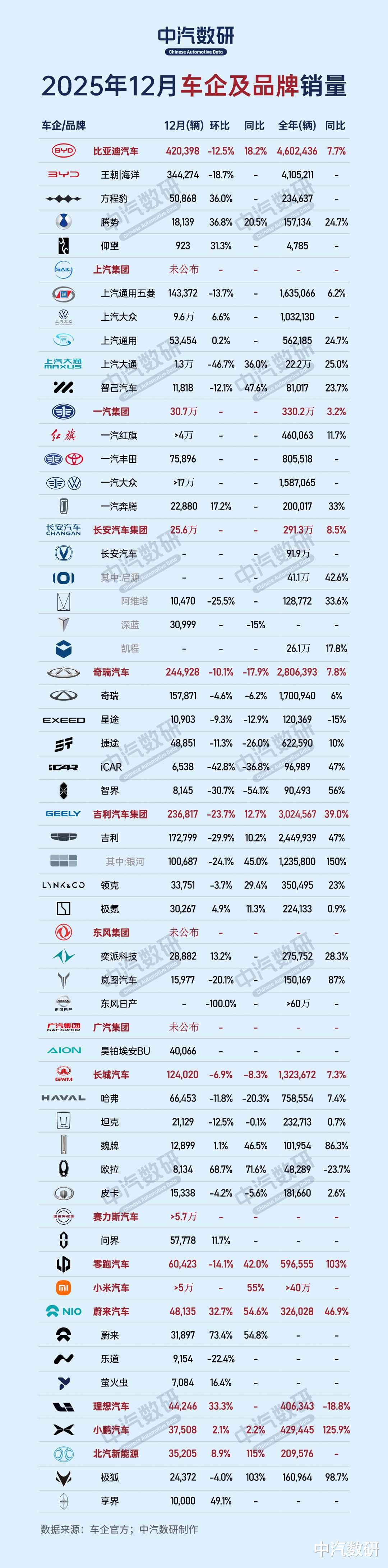 广汽集团:暂未公布12月及年度集团总销量。2026年1月2日,广汽集团宣布其自主品牌事业部改革取得重要进展。作为"番禺行动"改革计划的重要举措,昊铂与埃安两大品牌已完成BU(业务单元)整合,组建统一的事业部进行协同运营。改革成效在12月销量中得到体现,合并后的昊铂埃安BU单月销量突破4万辆大关,创下历史新高。其中,广汽埃安新推出的i60 SUV上市首月销量即达10,804辆。