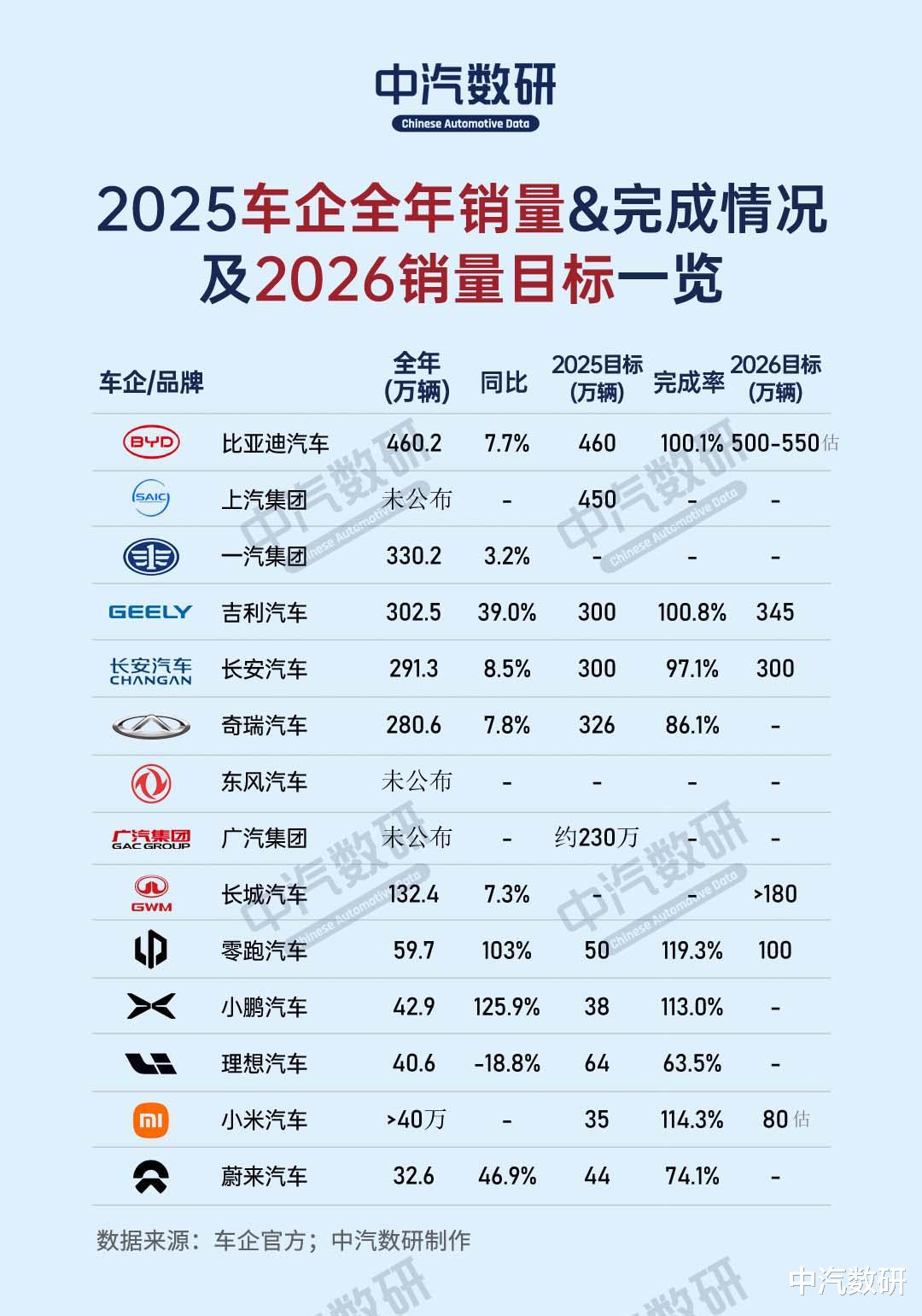 2025年12月及全年主流车企销量及目标完成情况出炉,传统车企“稳中有进”,新势力呈现“高增长与未达标并存”的分化格局,部分车企也已经制定了2026年销量目标: