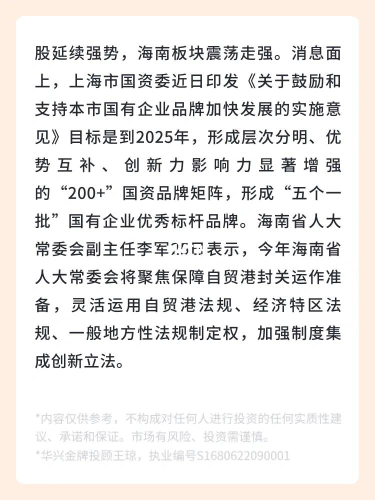 👉 地方国企改革概念股轮番活跃,上海本地股延续强势,海南板块震荡走强。消息面上,上海市国资委近日印发《关于鼓励和支持本市国有企业品牌加快发展的实施意见》目标是到2025年,形成层次分明、优势互补、创新力影响力显著增强的“200+”国资品牌矩阵,形成“五个一批”国有企业优秀标杆品牌。海南省人大常委会副主任李军25日表示,今年海南省人大常委会将聚焦保障自贸港封关运作准备,灵活运用自贸港法规、经济特区法规、一般地方性法规制定权,加强制度集成创新立法。
