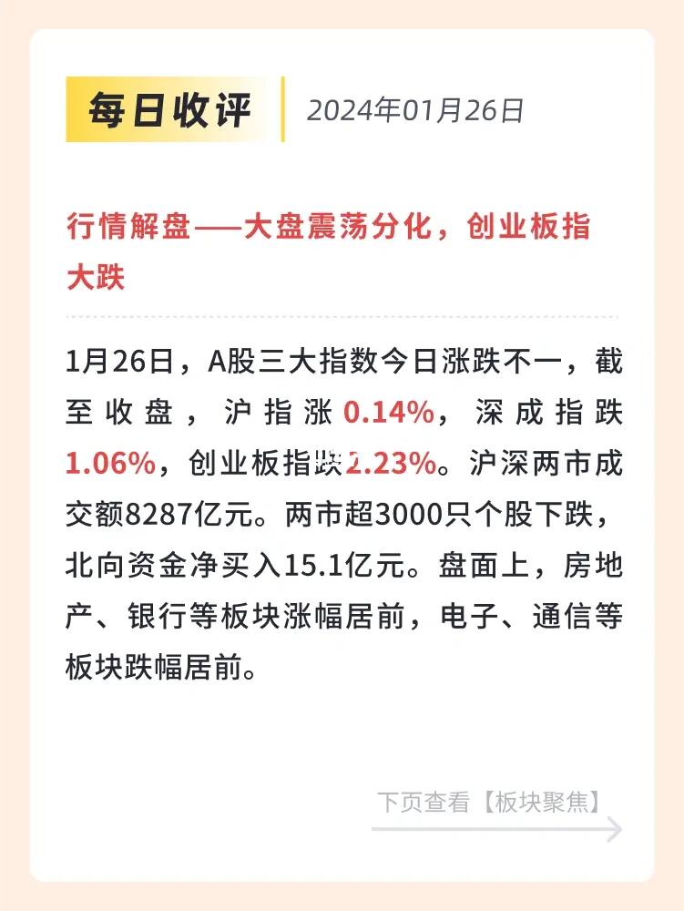 👉 1月26日,A股三大指数今日涨跌不一,截至收盘,沪指涨0.14%,深成指跌1.06%,创业板指跌2.23%。沪深两市成交额8287亿元。两市超3000只个股下跌,北向资金净买入15.1亿元。盘面上,房地产、银行等板块涨幅居前,电子、通信等板块跌幅居前。