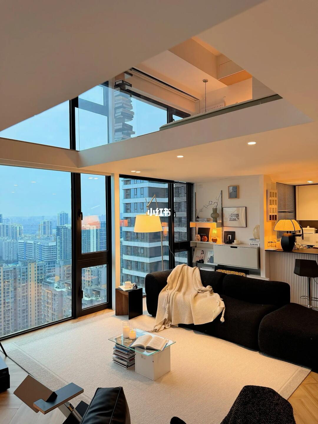 客厅挑空区域:挑空了2.2✖️3.3的面积我觉得是没有浪费空间,挑空一定是loft的灵魂,让客厅更加大气不压抑,空间感更强,晚上坐在客厅沙发上氛围感爆好