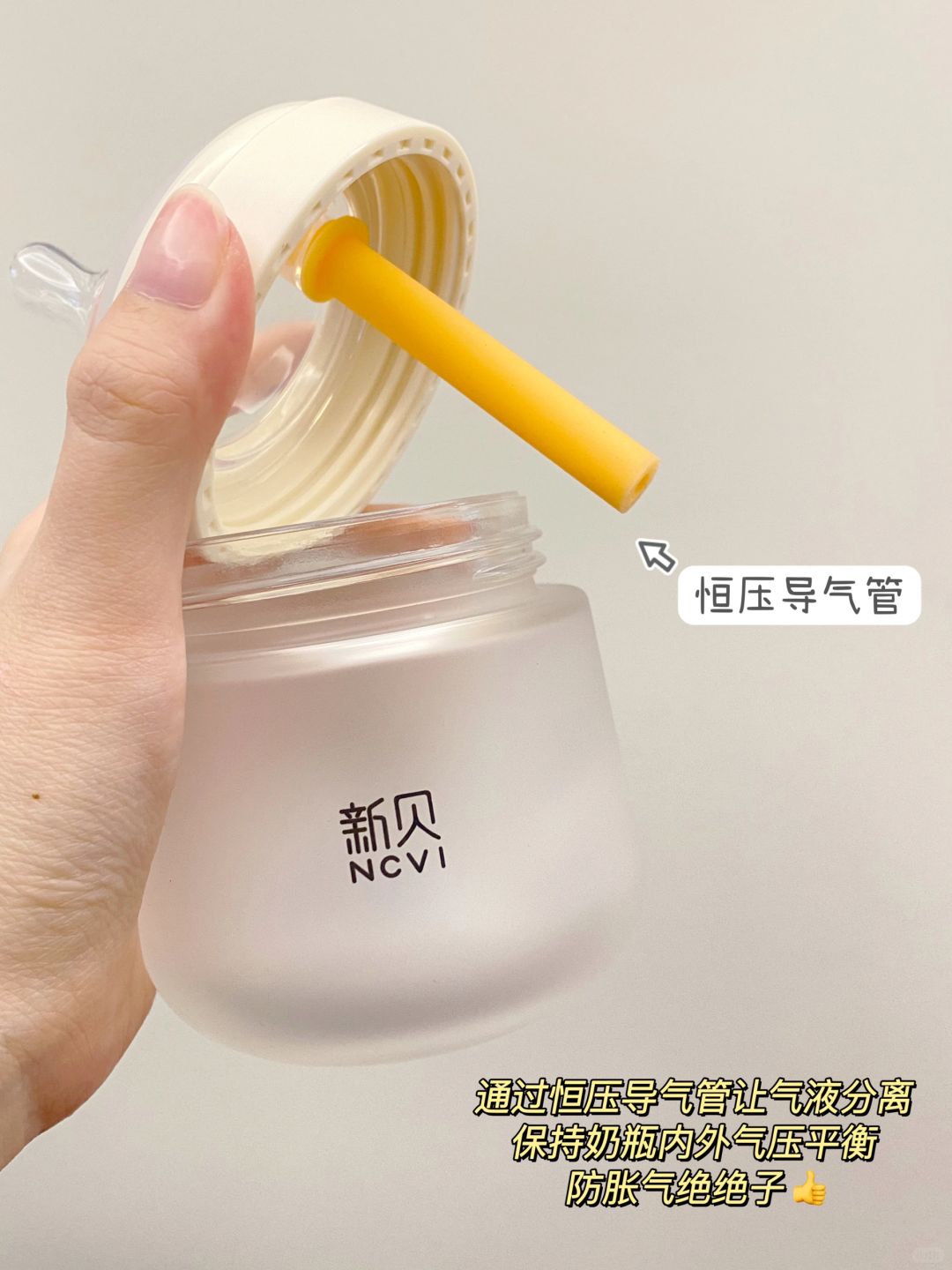 宝宝喝奶时空气会经过恒压导气管直达瓶底达到气液分离的效果,保持瓶内外气压平衡,宝宝吮吸也不费劲👏