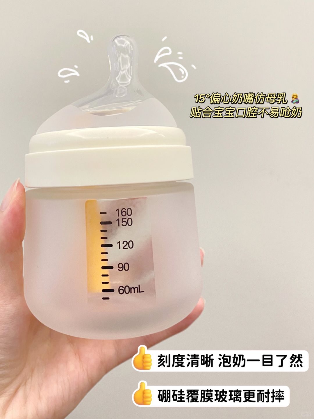 偏心奶嘴防呛设计很加分,奶液向上喷射💦宝宝喝奶不用仰头减少呛奶风险!并且是仿母乳设计,亲喂瓶喂都不影响哦!