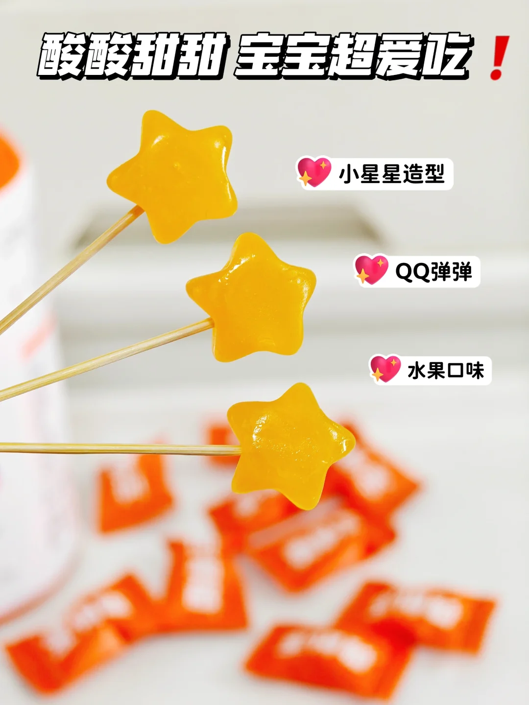 这个软糖是星星造型,口感QQ软软的,水果口味,酸酸甜甜,宝宝一口爱上。