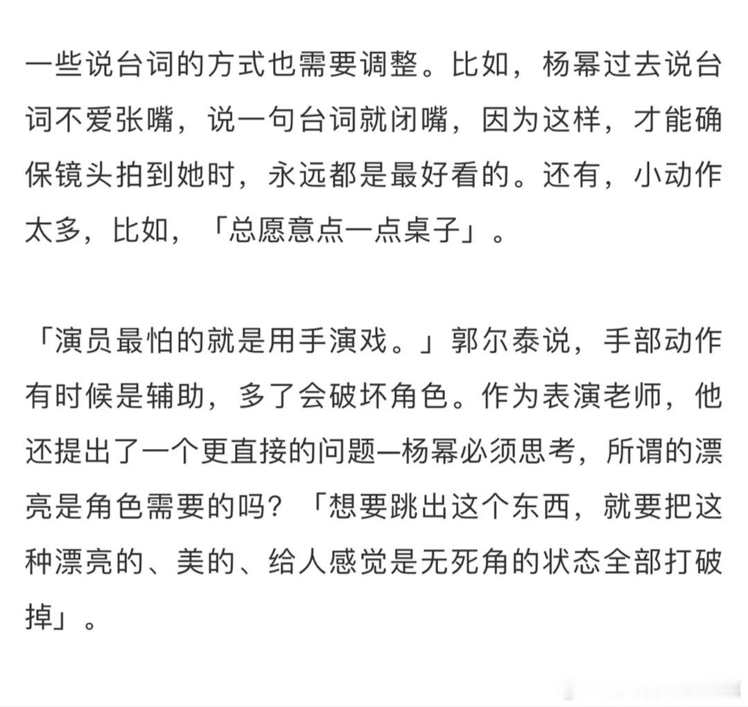 杨幂张黎新采访。确实是偶像剧演员通病,所以但凡有追求的演员都不能一直泡在里面。