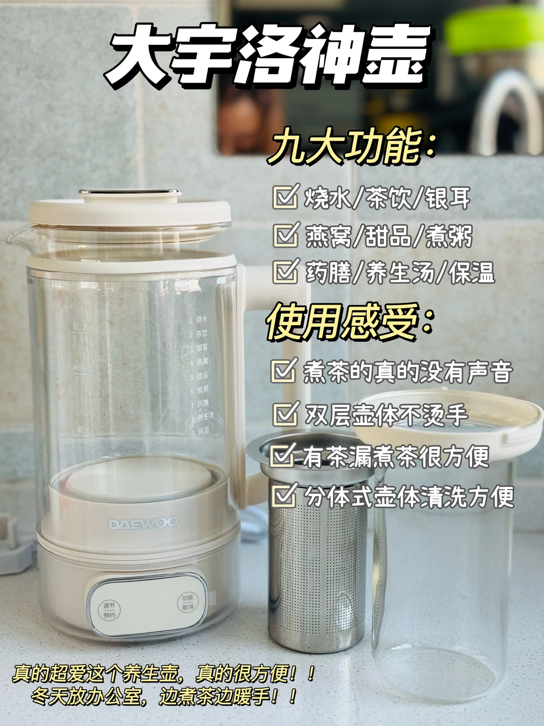 🌈顺便给大家分享我用的这个大宇洛神壶,真的很好用,方便!真的太爱这个养生壶了,颜值我也喜欢。这个养生壶煮茶的时候一点声音也没有,双层壶体不烫手,还可以当暖手宝宝😍。9大功能随意切换!