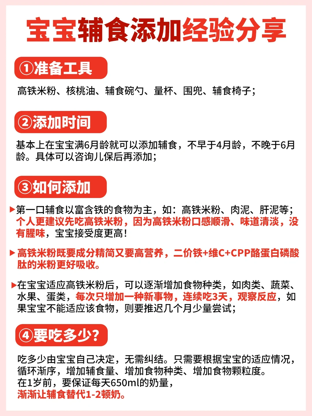 🔸我个人经历建议第一口辅食为高铁米粉,因为米粉口感顺滑、味道更容易被宝宝接受,从而增强对辅食的兴趣。