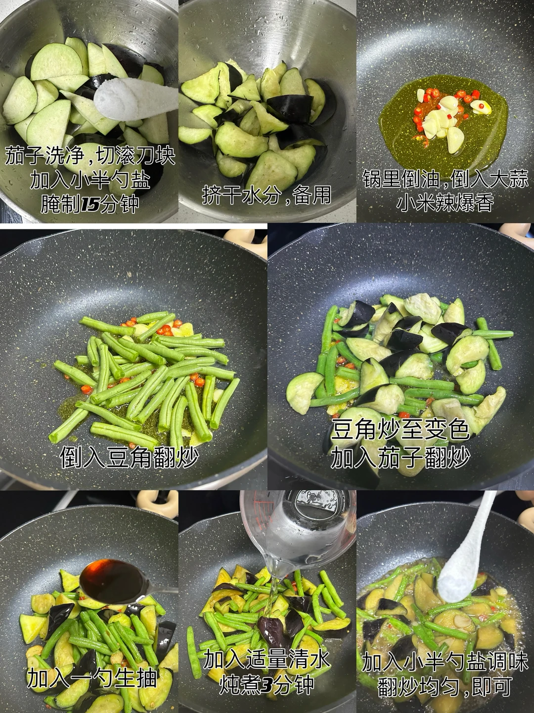 2️⃣锅里倒油,放入蒜片,小米辣爆香,倒入豆角翻炒,炒至变色,加入茄子翻炒,加入适量清水,焖煮3分钟,加入小半勺盐调味,即可