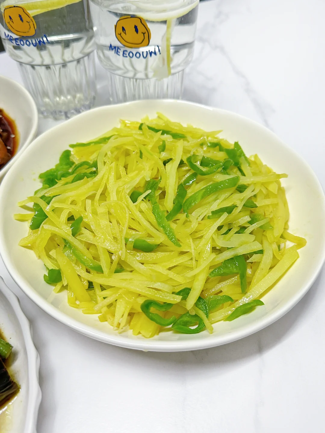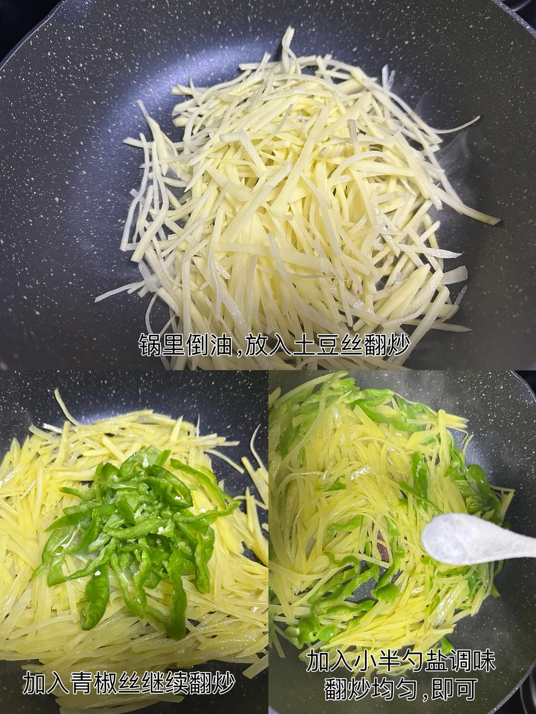 1️⃣锅里倒油,放入土豆丝翻炒,加入青椒丝继续翻炒,加入小半勺盐调味,翻炒均匀,即可