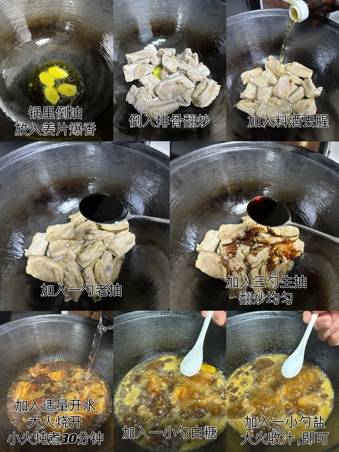 2️⃣锅里倒油,放入姜片爆香,倒入排骨翻炒,加入适量料酒去腥,加入一勺老抽,3勺生抽,翻炒均匀,加入适量开水,大火煮开,小火炖煮30分钟