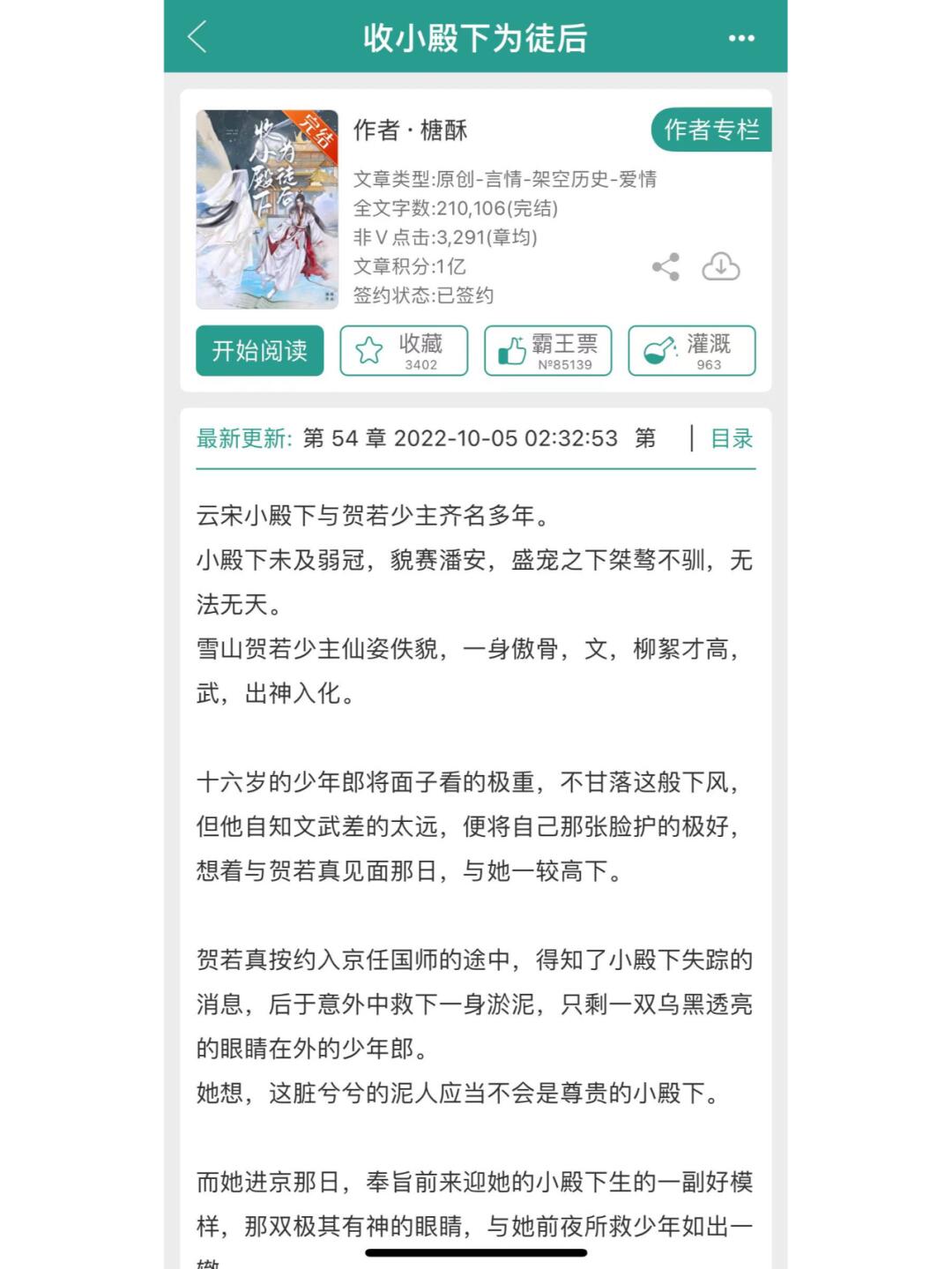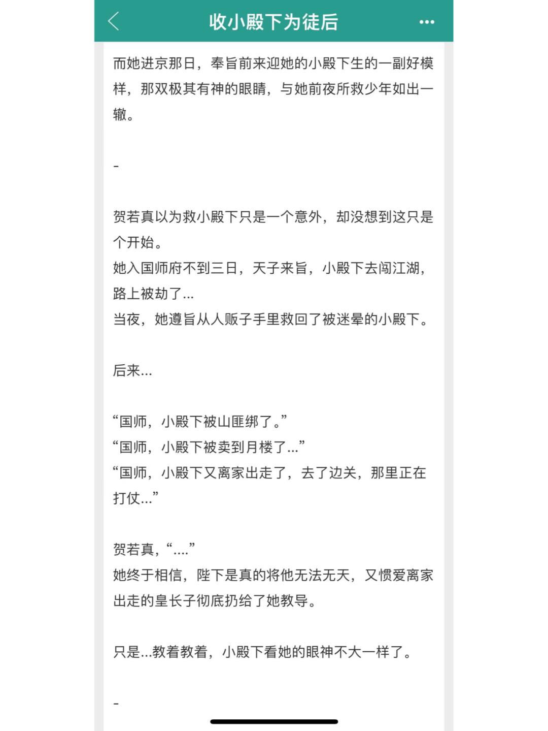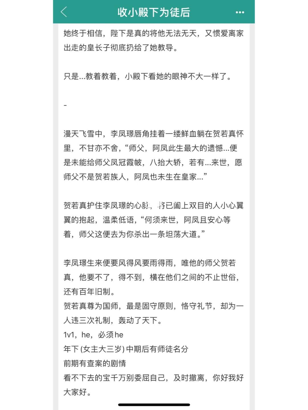 本期推荐:《收小殿下为徒后》,作者:榶酥 主角:贺若真/李凤璟 一句话简介:小殿下他又离家出走了 立意:并肩成长,彼此成就 *清醒理智国师vs傲娇聪慧皇长子 *主打一个年下姐弟恋,与世隔绝的女主因为上一辈的原因,下山成为国师。男主是皇长子,原本天真傲娇聪慧,一心想闯荡江湖。在机缘巧合下,女主成为了男主的老师,两人在相处中,一起成长,一起面对迎面而来的艰难困苦。