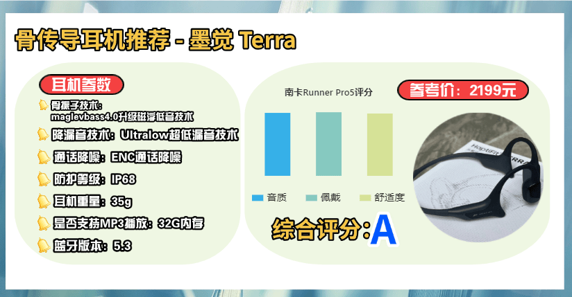 墨觉作为近年来崛起的骨传导耳机品牌,在运动耳机细分领域持续投入研发,重点打磨低频表现与佩戴稳定性。Terra 定位于高强度运动场景的耳挂式骨传导耳机,强调稳固结构与高等级防护,更适合偏好强节奏、重律动听感的运动场合。