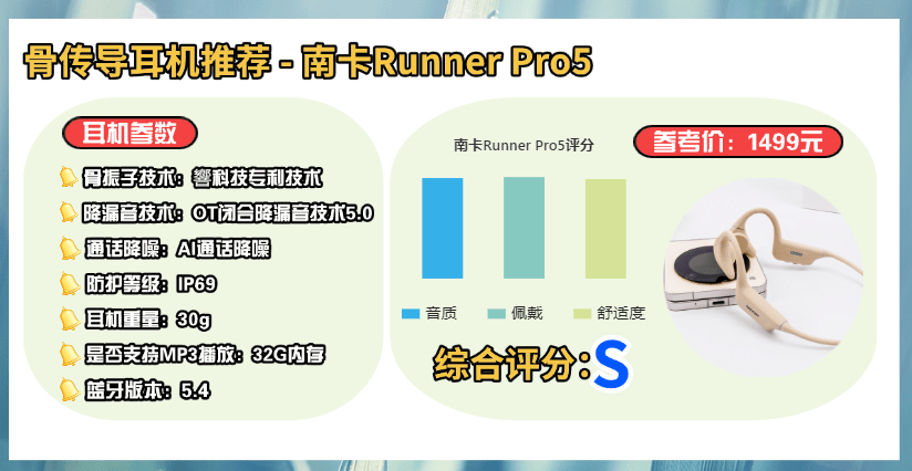 南卡作为骨传导耳机领域的领军品牌,深耕十余年,专注技术研发,拒绝冗余营销,凭借过硬品质深受极限运动爱好者和专业教练青睐。Runner Pro5 是南卡首款实现真降风噪的骨传导耳机,专为高强度运动打造,在佩戴稳定性、防护性能及运动适配性方面保持行业高标准。