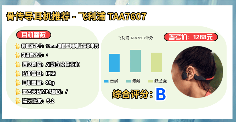 飞利浦作为国际知名电子品牌,在声学与可穿戴设备领域积累深厚。TAA7607 主打稳定可靠与舒适佩戴体验,整体取向偏务实,适合日常锻炼与通勤场景,对性能稳定性有较高要求的人群可重点关注。