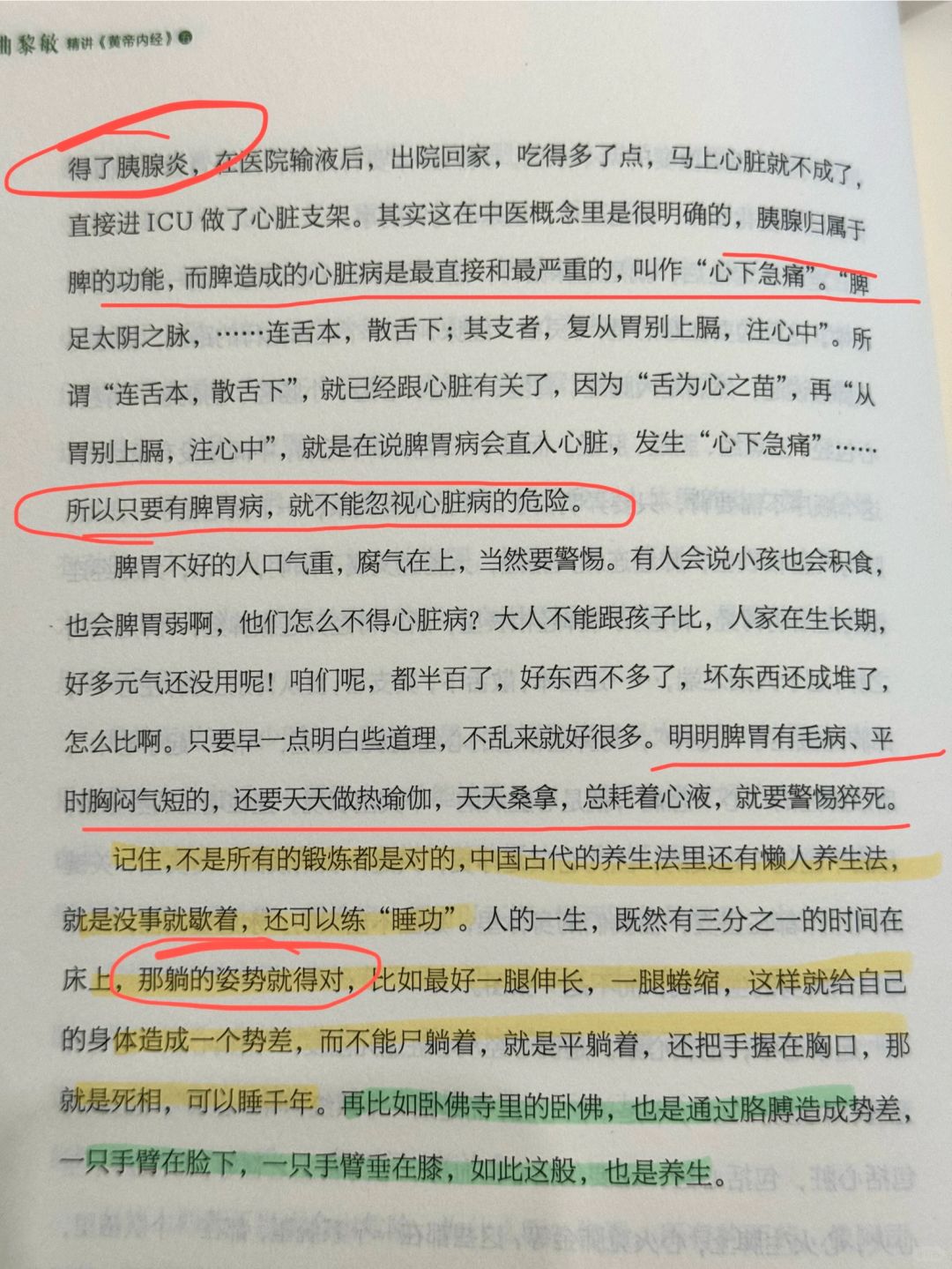 人的一生,既然有三分之一的时间在床上,那躺的姿势就得对 比如最好一腿伸长,一腿蜷缩,这样就给自己的身体造成一个势差,而不能尸躺着,就是平躺着,还把手握在胸口,那就是死相,可以睡千年。再比如卧佛寺里的卧佛,也是通过賂膊造成势差,一只手臂在脸下,一只手臂垂在膝,如此这般,也是养生 明明脾胃有毛病、平时胸闷气短的,还要天天做热瑜伽,天天桑拿,总耗着心液,就要警惕猝死。