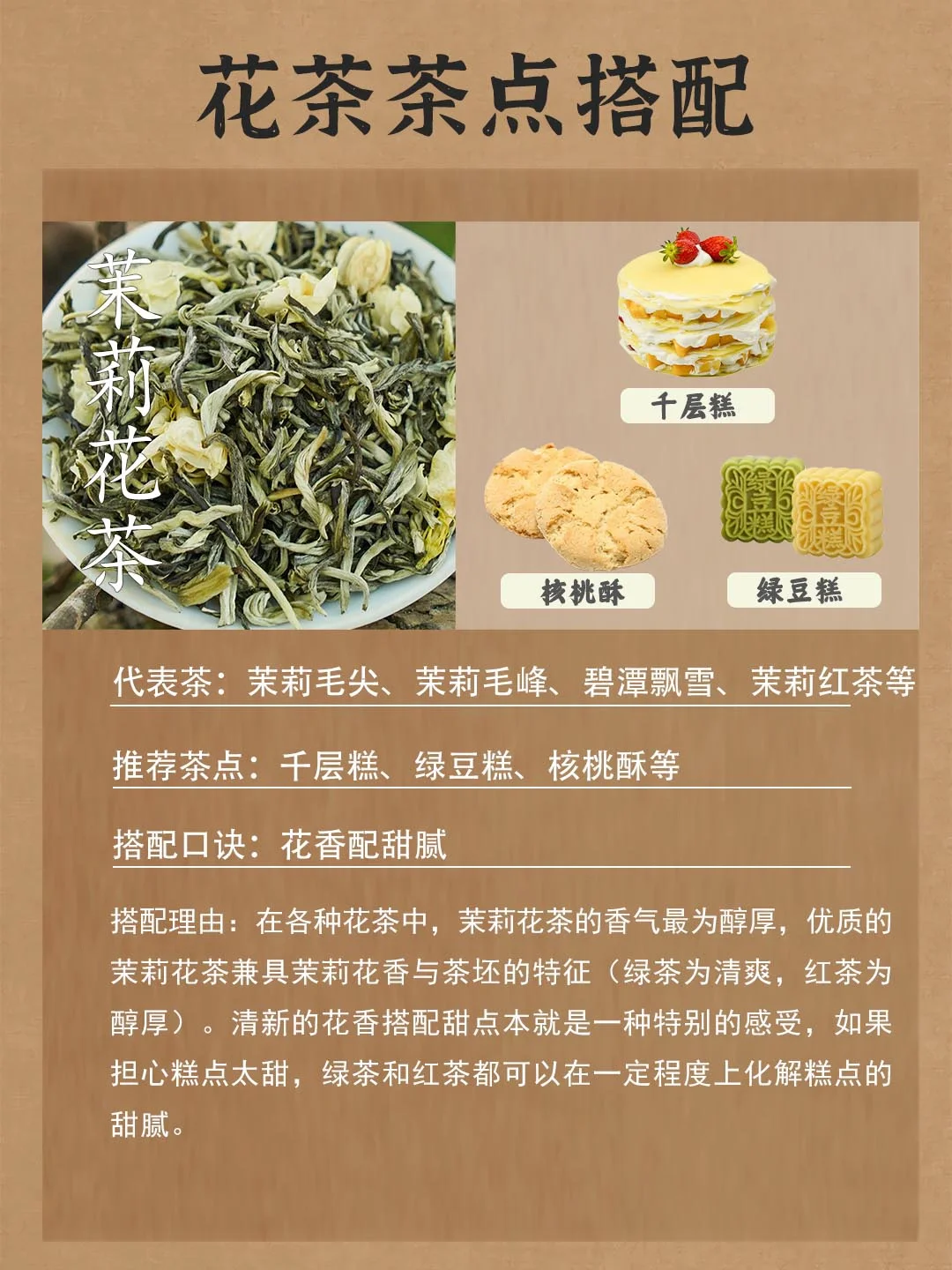 🍵茉莉花茶茶点搭配建议:千层糕、绿豆糕、核桃酥。