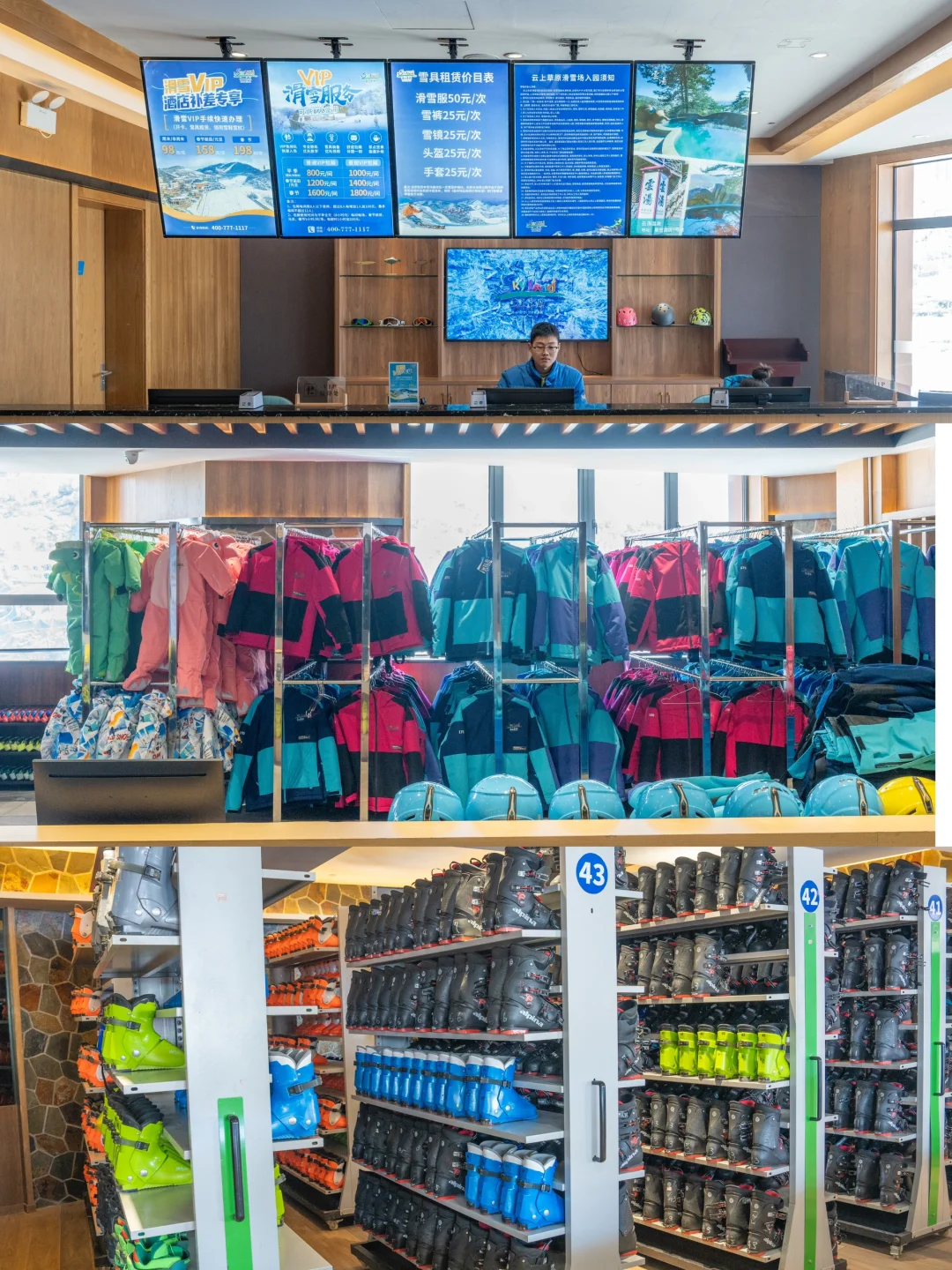 杭州自驾1h,到达游客中心➡游客中心买票➡乘坐大巴➡乘坐缆车➡滑雪大厅领取手环➡1楼租装备➡-1楼换衣服/领雪板➡体验滑雪➡归还装备