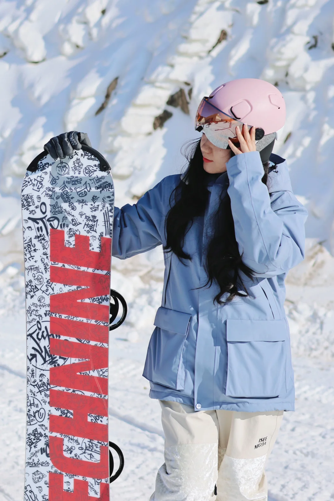 外套粉色、蓝色比较出片,丸子自备的蓝色滑雪服,保暖又出片
