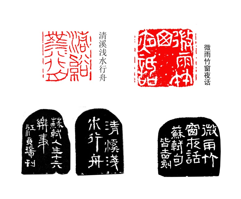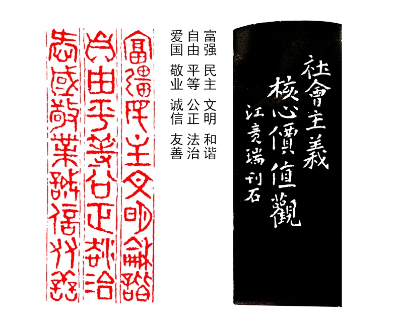 丹册篆刻体现“印外求印”深入实践。江竟瑞先生熔古玺的苍茫、汉印的整饬、明清流派的意趣于一炉,独以“史册格”打破空间局限,驾驭文字于纵向延伸中获“线性叙事”节奏。其作品既有古玺汉印的“气象”,又规避旧范式的“桎梏”,通过竖线架构与文字形神共生,实现精巧流美与朴厚高逸的有机统一。这种美学高度、角度及尺度的突破,其本质在形式与内容、视野与观念、文化与人生的深度融合。竖线为“史”,文字为“道”,他以自撰文辞表达时代哲思,以经典名句叩问文明内核,篆刻便从技艺展示升华为思想表达。江竟瑞先生或朴诚或激情地演绎文字造型,既把握古玺汉印气象,又与时俱进彰显人类文明精华,使丹册篆刻彰显“载道抒情”主旨。