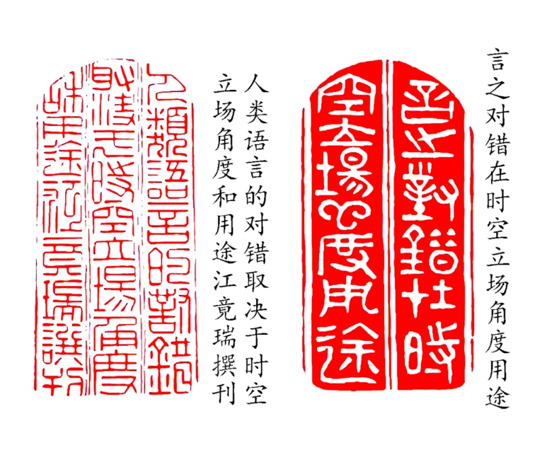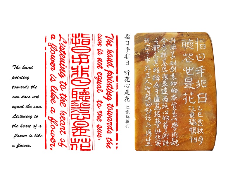 江竟瑞丹册篆刻的价值不仅在形式创新,更在于以东方智慧回应全球命题。比如他的“道伴全息”印,印文直接揭示事理(真理)与事物完全融和的关系——事物的全息小无内、大无外,人类语言和图示无以表达完整,只能是出于特定用途,居于特定时空、立场和角度来摘要立说,语言文字和图示系统就裹挟着无限的隐形元素,绝不等于事物和事理本身。“道伴全息”融合了传统道家“道法自然”的哲学观与现代“全息”理念,强调宇宙万物在“道”的统摄下浑然一体、动态共生的状态。这不仅是一种崭新的哲学观,更是一种认知方法论,意在以更开放、更整体的方式去理解和参与这个世界。江竟瑞先生以“非遗传承师”身份打破了“匠人”窠臼,以“哲人”视野、智慧之言重构了篆刻价值维度。“爱读巨人书,关注前沿说”的跨界多维修养,使其成为赓古续今的“文化介质”。丹册篆刻以“内容载道、形式载史、精神载文明”的三重创新,拓宽了篆刻艺术的边界。其超越性让丹册篆刻从“民族的”变为“世界的”。通过引用西方哲言(如“认识自我”)直接显现全人类思维语境,让“史册格”串联古今中外文明智慧,有的印作通过中外文字并用,于刀笔间、文字内承载文明重量,使丹册篆刻具备了“人类文明证物”的潜质。从河北美术出版社出版《江竟瑞篆刻作品赏析》,到2016年入展民族文化宫书画篆刻展、2023年入编《荣宝斋•特刊》,再到2025年荣登红墙杂志《中华英才》和央视《大国品牌》,等等艺术活动与表现,江竟瑞先生用实践印证了丹册篆刻的学术高度与文化价值。