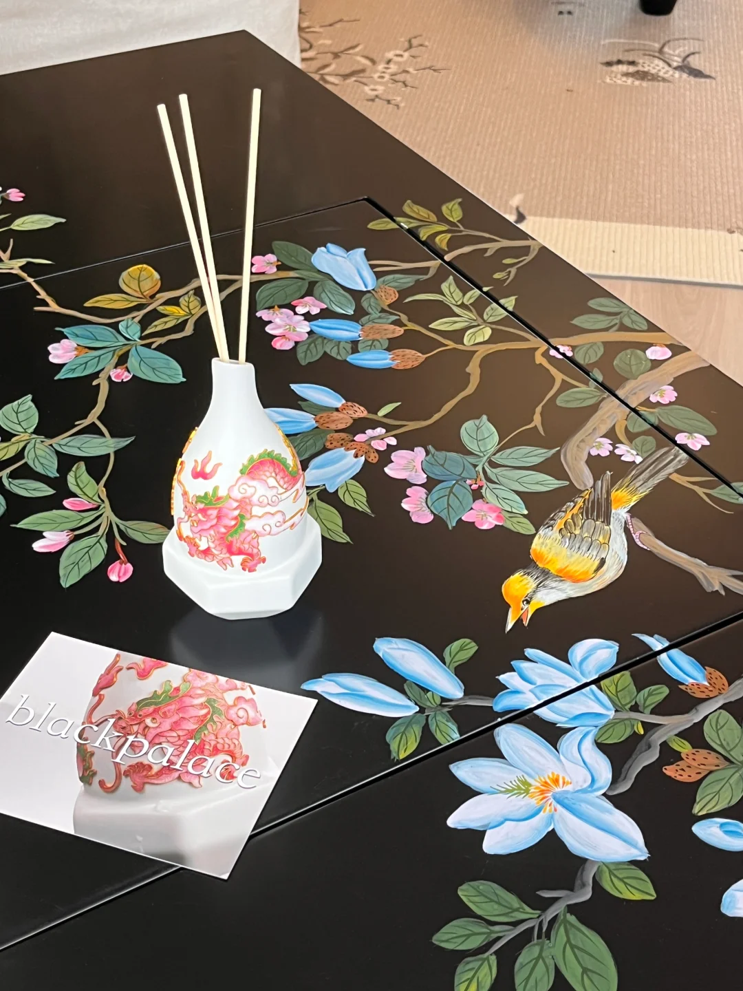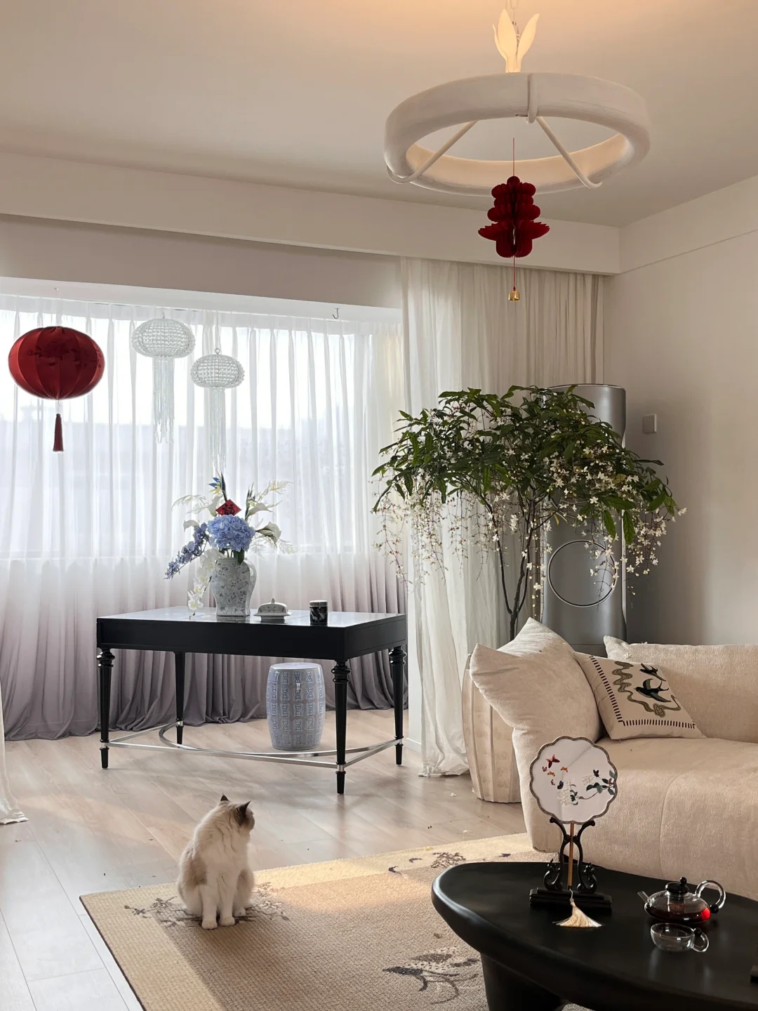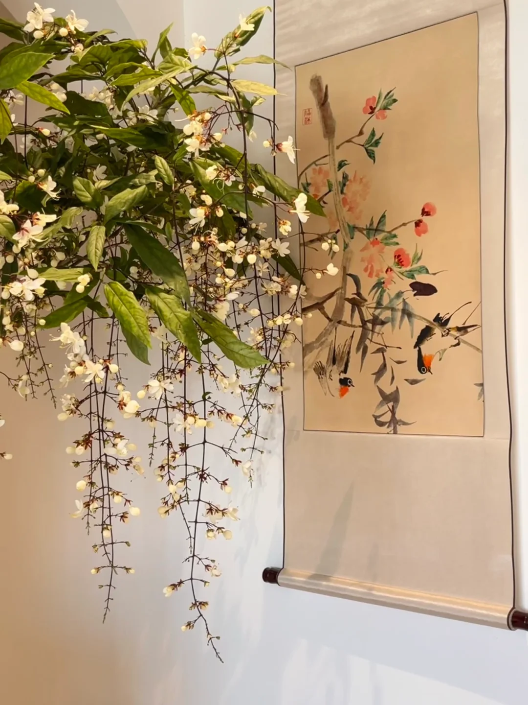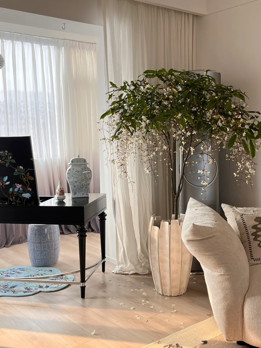 他就像仙女一样在客厅,搭配我的手绘花鸟书桌和花鸟莺燕地毯,整个客厅灵动又仙气。
