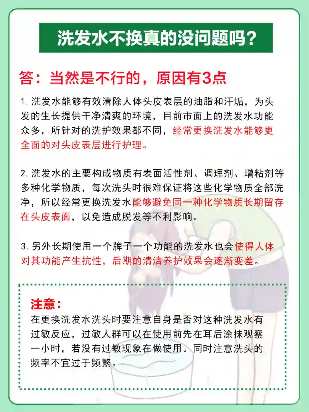 💥2.洗发水的主要构成物质有表面活性剂、调理剂、增粘剂等多种化学物质,每次洗头时很难保证将这些化学物质全部洗净,所以经常更换洗发水能够避免同一种化学物质长期留存在头皮表面,以免造成脱发等不利影响。