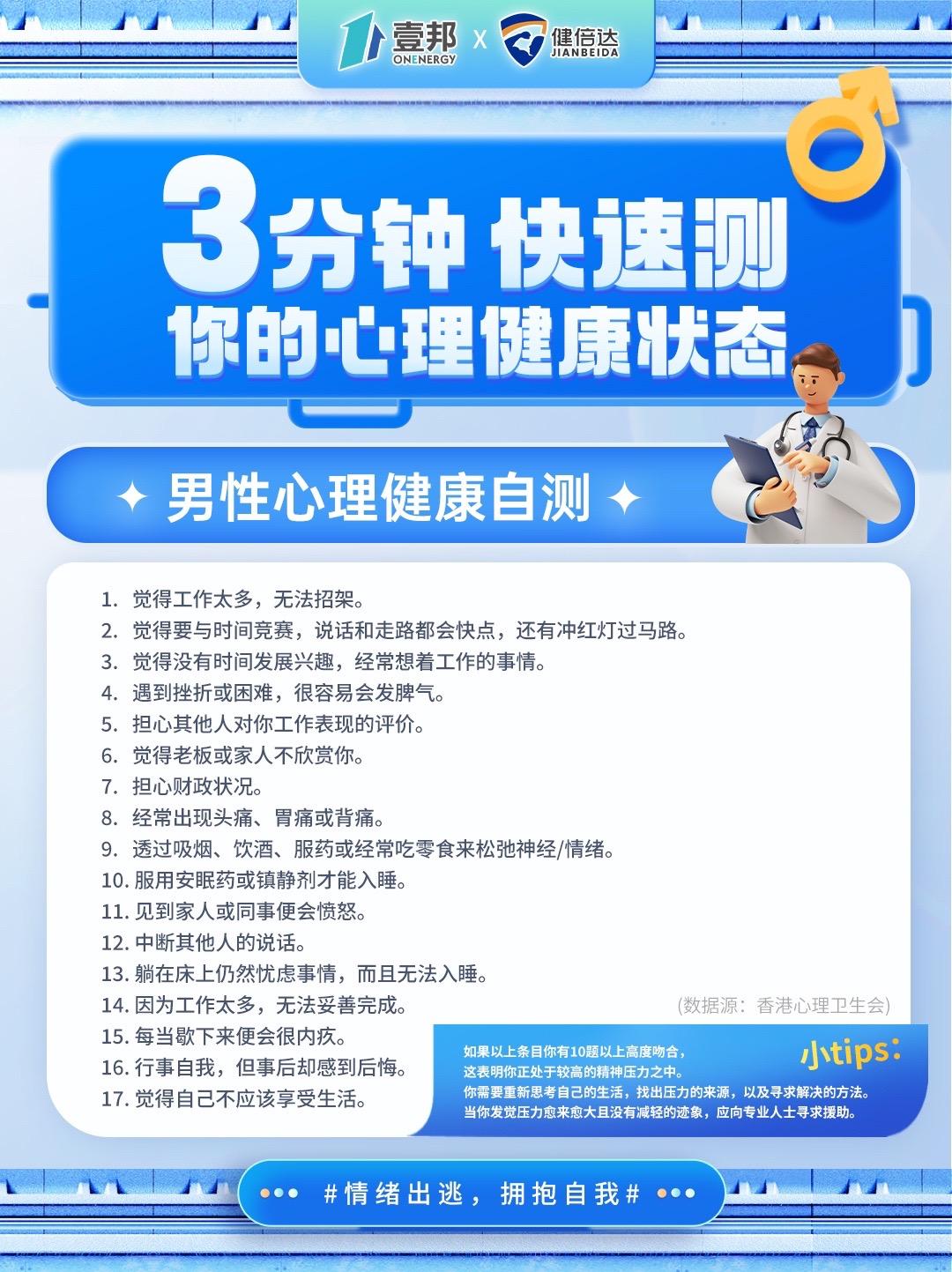 Psychiatric Association WPA)发起,旨在提高广大群众对精神卫生重要性的认识,呼吁个人关注心理精神健康,提高心理健康和精神卫生水平。男性作为其中一个压力群体,关注自身心理健康,寻找压力来源,适当进行心理疗愈十分重要。让我们一起