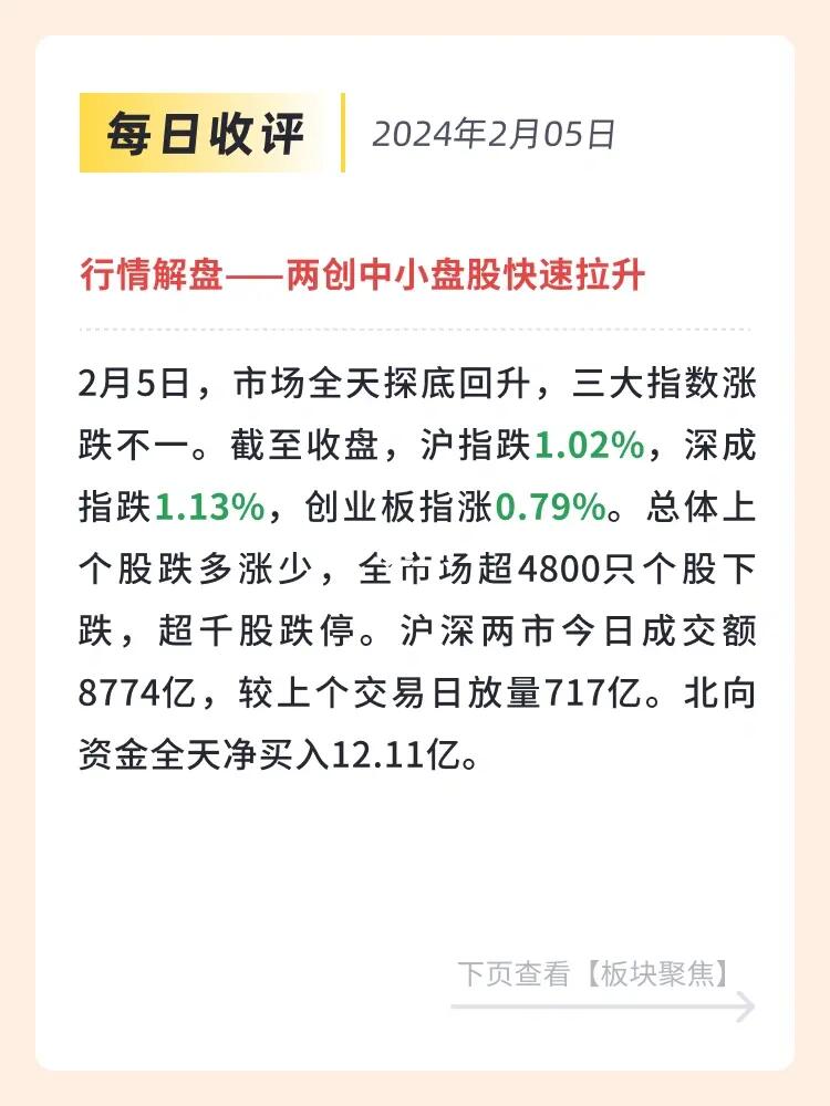 👉 【行情解盘——两创中小盘股快速拉升】2月5日,市场全天探底回升,三大指数涨跌不一。截至收盘,沪指跌1.02%,深成指跌1.13%,创业板指涨0.79%。总体上个股跌多涨少,全市场超4800只个股下跌,超千股跌停。沪深两市今日成交额8774亿,较上个交易日放量717亿。北向资金全天净买入12.11亿。