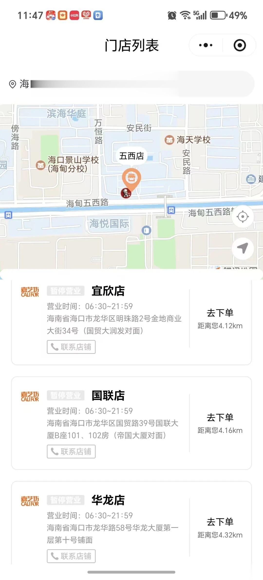 通过扫码进入嘉艺坊小程序,海口市24家门店均呈浅灰色显示“暂停营业”。