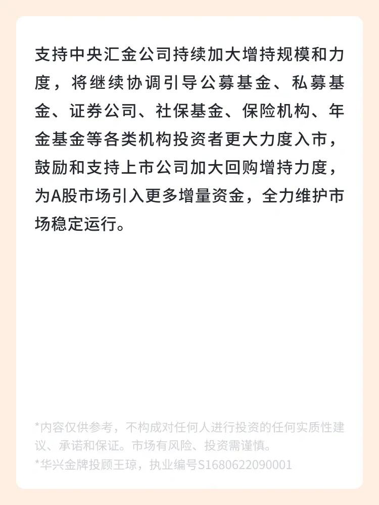 👉 与此同时,中央汇金发布公告,充分认可当前A股市场配置价值,已于近日扩大交易型开放式指数基金增持范围,并将持续加大增持力度、扩大增持规模,坚决维护资本市场平稳运行。据此证监会表示,坚定支持中央汇金公司持续加大增持规模和力度,将继续协调引导公募基金、私募基金、证券公司、社保基金、保险机构、年金基金等各类机构投资者更大力度入市,鼓励和支持上市公司加大回购增持力度,为A股市场引入更多增量资金,全力维护市场稳定运行。