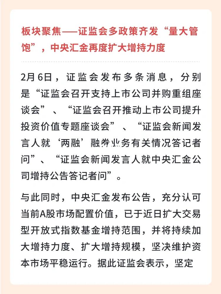 👉 2月6日,证监会连发4条要闻,分别是“证监会召开支持上市公司并购重组座谈会” 、“证监会召开推动上市公司提升投资价值专题座谈会” 、“证监会新闻发言人就‘两融’融券业务有关情况答记者问”。