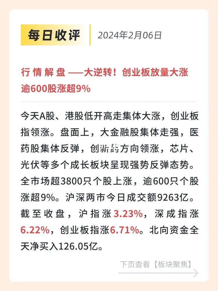 👉 今天A股、港股低开高走集体大涨,创业板指领涨。盘面上,大金融股集体走强,医药股集体反弹,创新药方向领涨,芯片、光伏等多个成长板块呈现强势反弹态势。全市场超3800只个股上涨,逾600只个股涨超9%。沪深两市今日成交额9263亿。截至收盘,沪指涨3.23%,深成指涨6.22%,创业板指涨6.71%。北向资金全天净买入126.05亿。