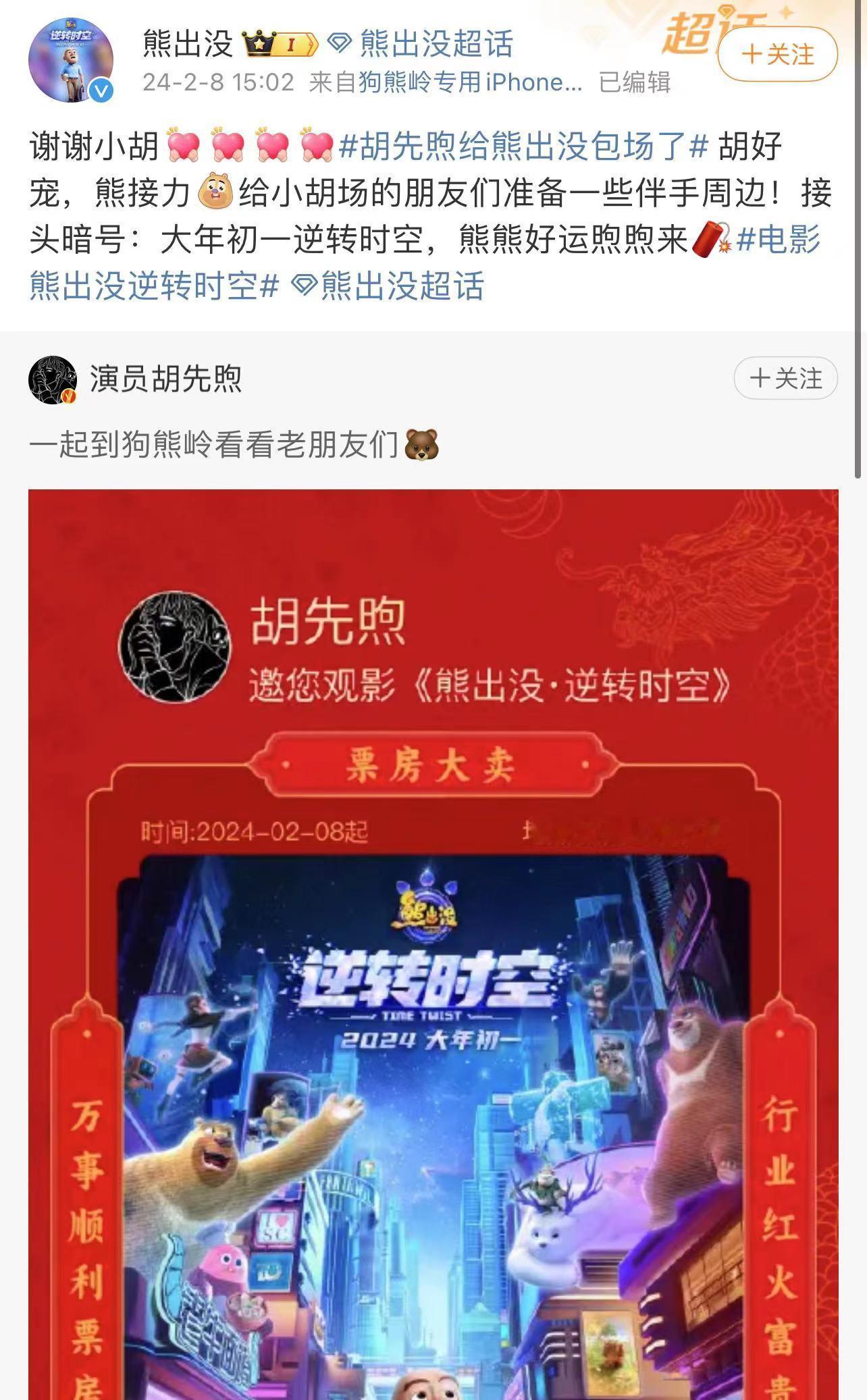 #胡先煦给熊出没包场了##和熊出没的十年之约# 光头强,不是,胡先煦给《熊出没·逆转时空》包场了,十年之约,光头强和熊大熊二的友谊真的好让人感动