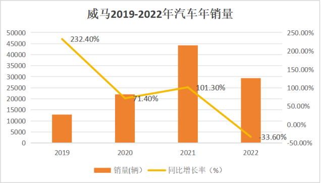 最显著的表现就是销量下滑,2019年至2021年,威马汽车年销量分别为12799辆、21937辆和44152辆,呈现稳步上升态势。可到了2022年,威马全年销量29327辆,同比下降33.6%,被哪吒和埃安拉开了十几万,甚至二十多万辆的差距。