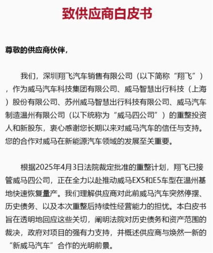 2025年9月份,深圳翔飞汽车销售有限公司正式接管了威马四家核心公司,与此同时还发布了《致供应商白皮书》,推出复活计划,深圳翔飞投资10亿元。
