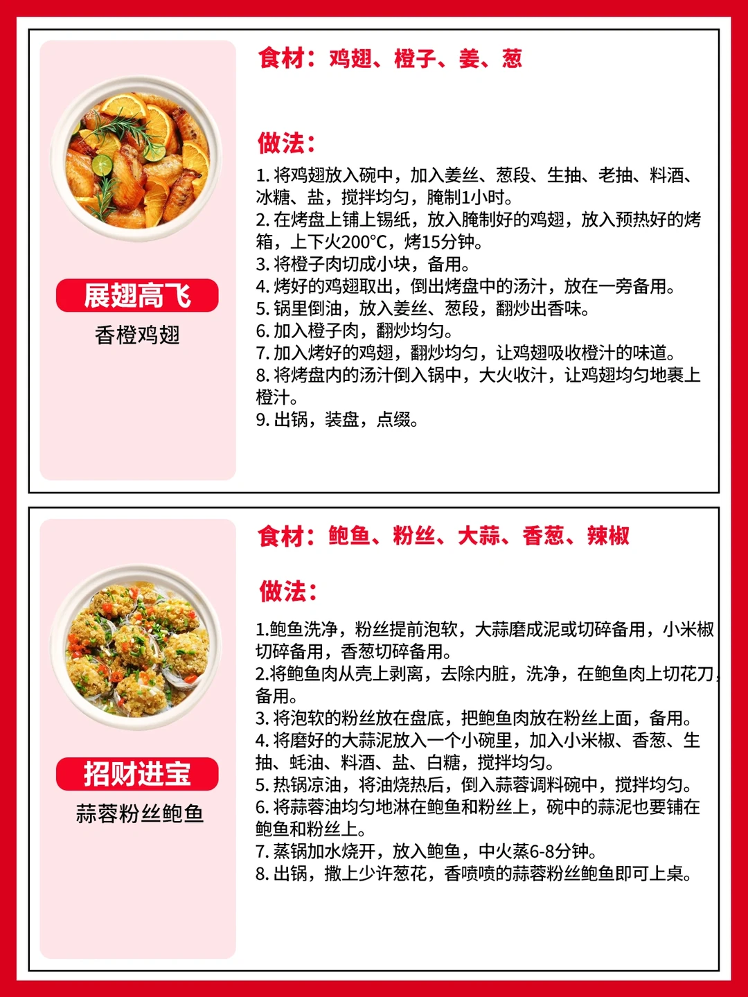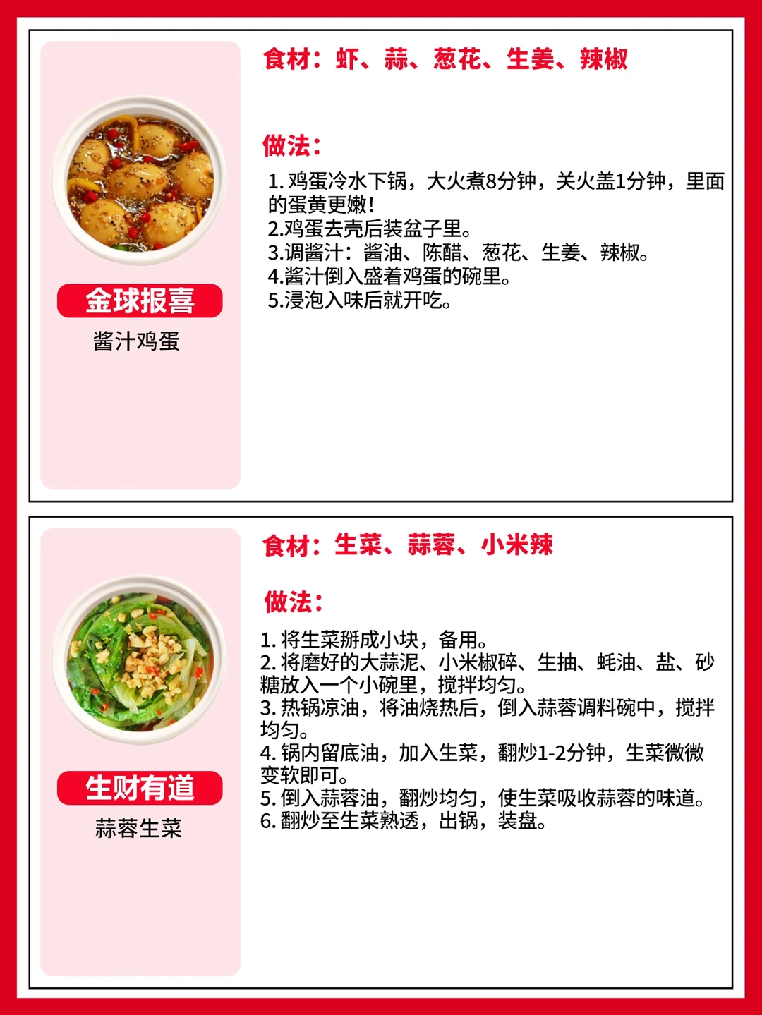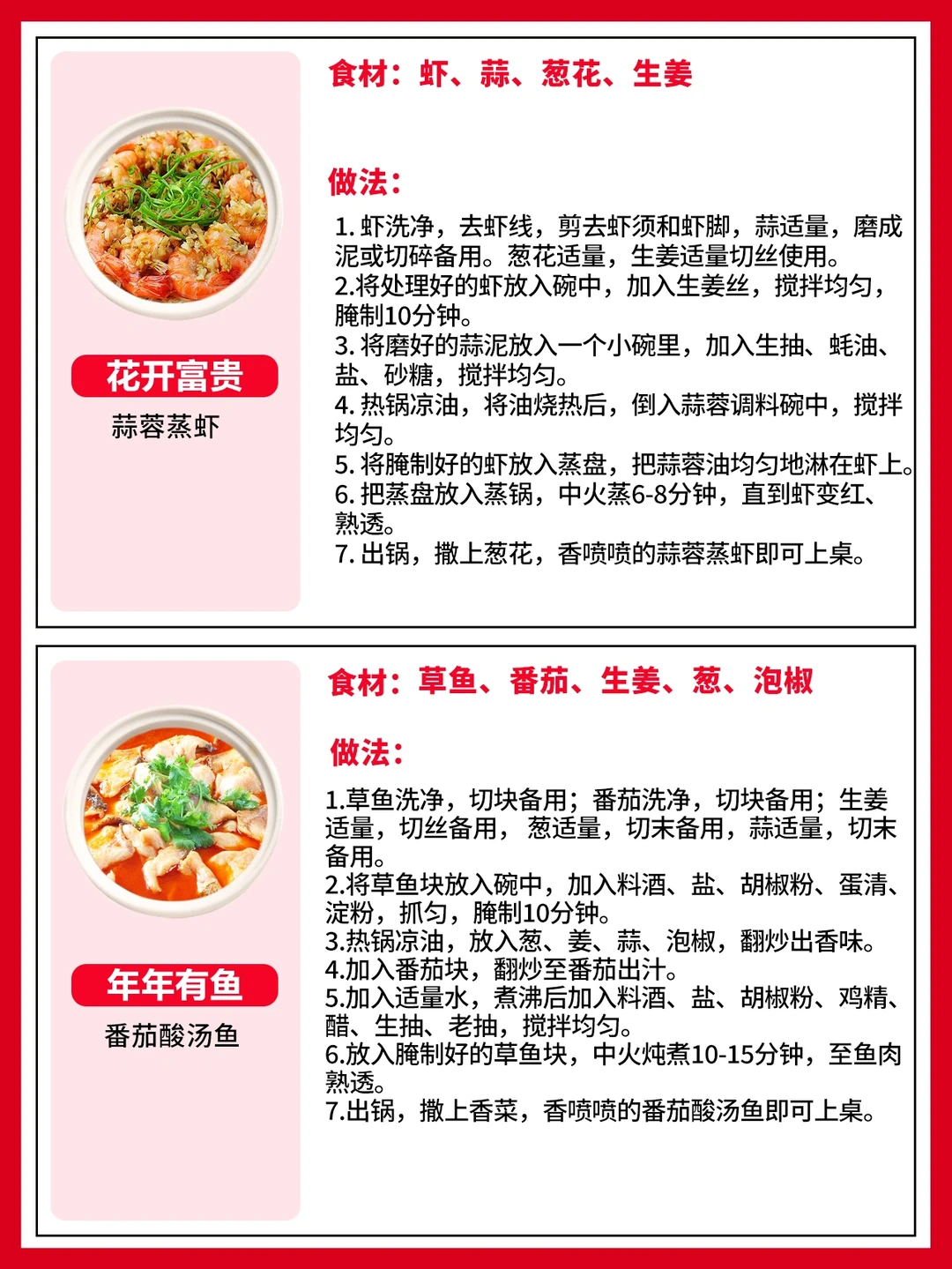 除夕快到, 快来让我看看,是谁还没想好年夜饭该吃啥做啥[微笑R] 今天我分享我家年夜饭菜谱 , 简单好做又好吃, 详细做法在图②—⑨, 快来抄作业❗ . 今年过的菜: 红红火火 蒸蒸日上 大展宏图 牛气冲天 鸿运当头 招财进宝 团团圆圆 腰财万贯 节节高升 好运连连 金玉满堂 福气延绵 花开富贵 年年有鱼 金球报喜 生财有道 . 以上也是我给大家的祝福❗