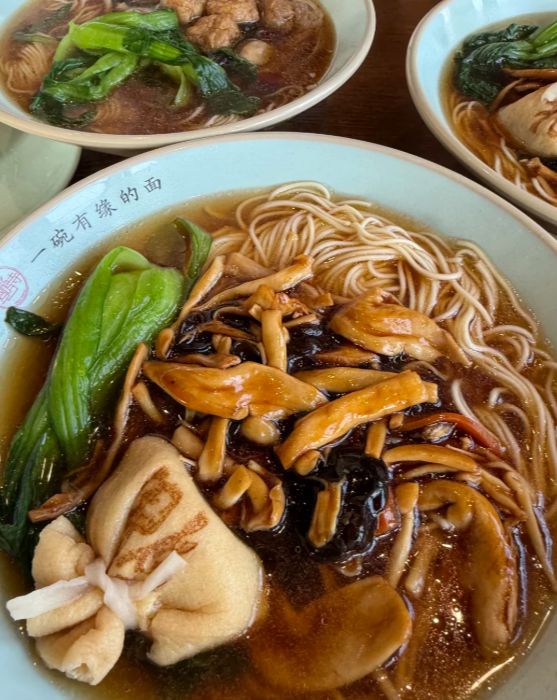 点一道经典的素烧鹅,它并非真正的鹅肉,而是用油豆皮包裹着香菇、笋丝、胡萝卜丝等馅料,经调味后卷起蒸熟,再稍加煎制而成。成品色泽金黄,外形酷似烧鹅,口感层次丰富,豆皮的韧、香菇的嫩、笋丝的脆交织在一起,咸鲜可口。