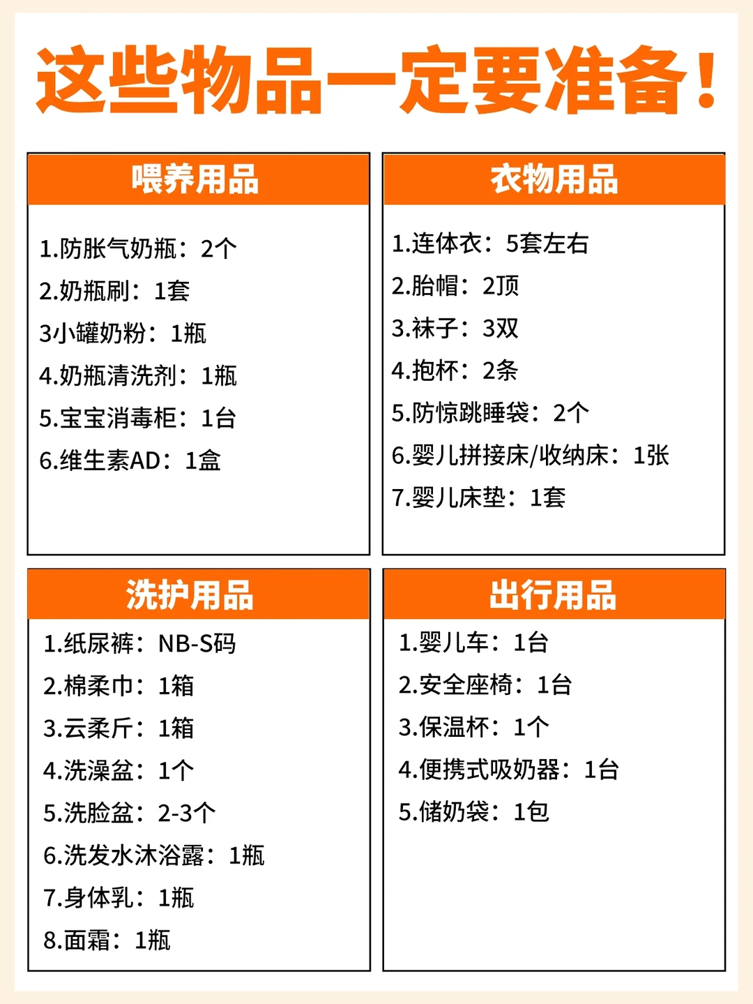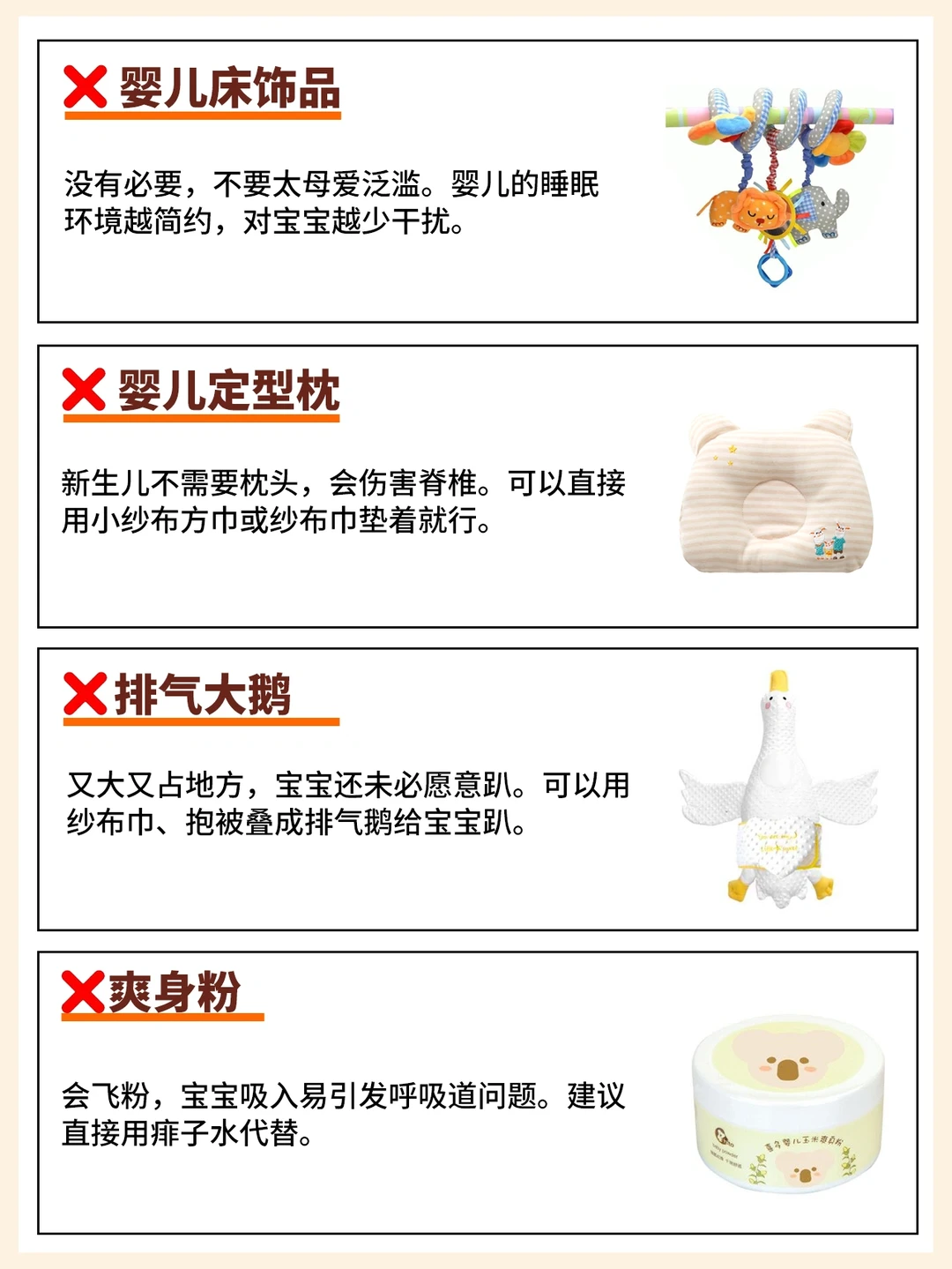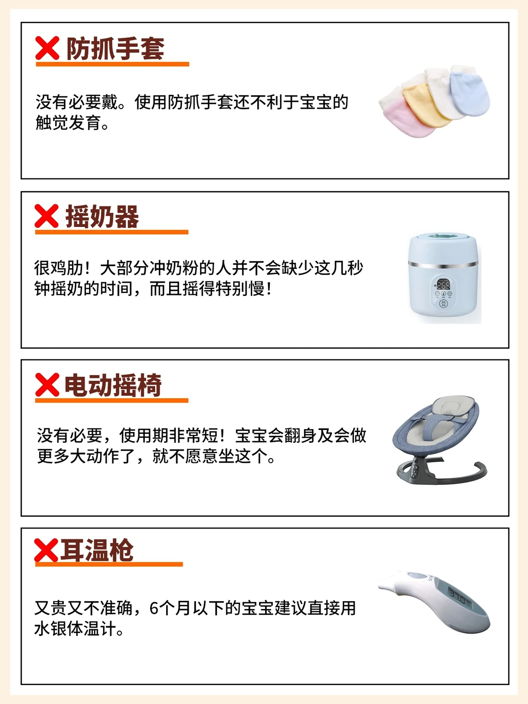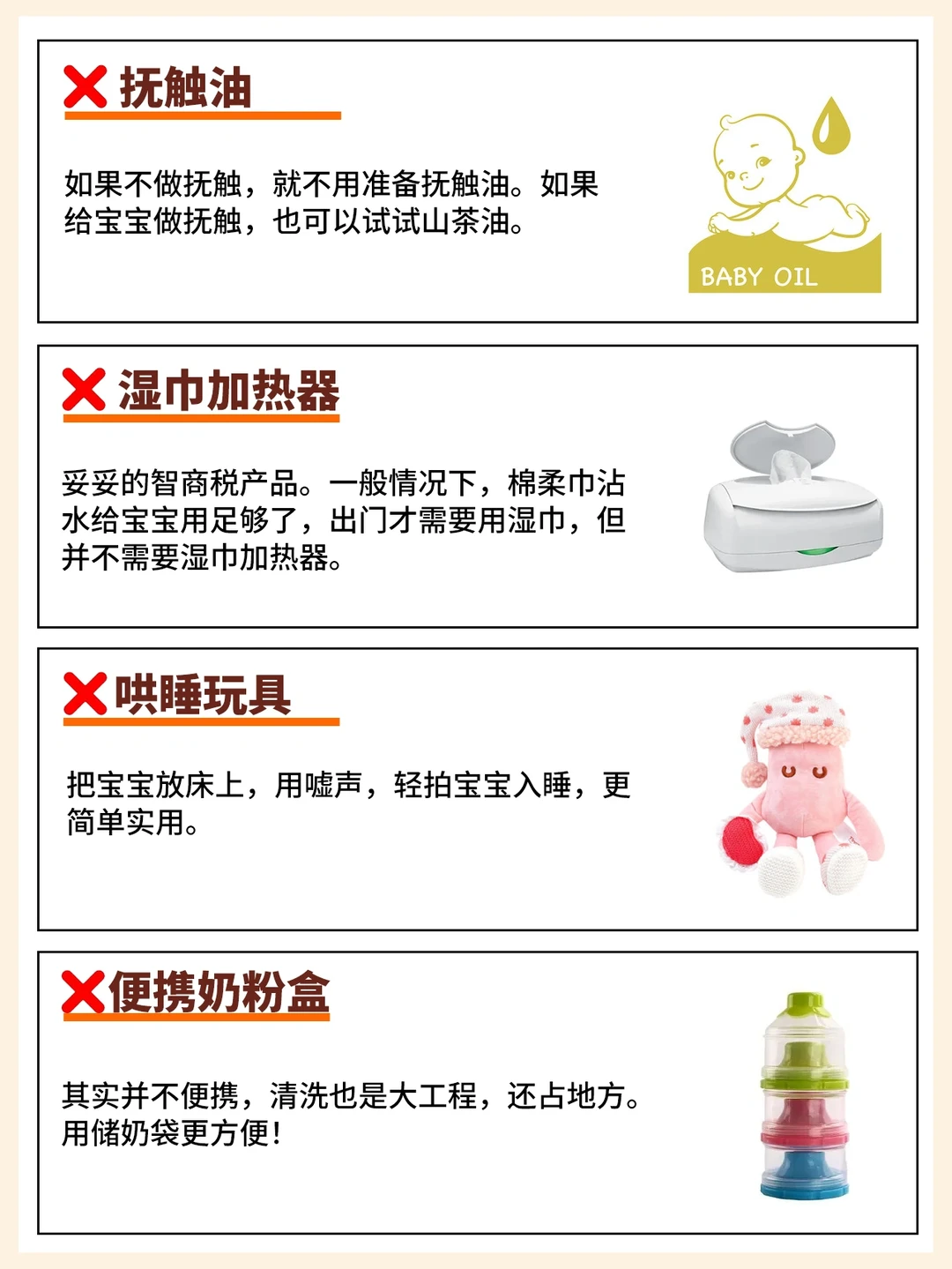 不用买: 传统高景观婴儿车 婴儿床 婴儿提篮 婴儿床饰品 婴儿定型枕 排气大鹅 爽身粉 抚触油 湿巾加热器 哄睡玩具 便携奶粉盒 防抓手套 摇奶器 电动摇椅 耳温枪