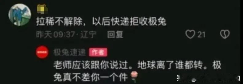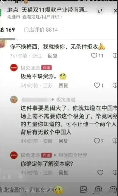 极兔是真的刚! 极兔表示支持梅西,网友表示极兔不缺客户 中国也不缺快递,以后我看到发极兔快递就马上退货,买之前就给商家说不要发极兔快递,发了极兔快递就退货就是了。 国人就是这样,今天抵制这,明天抵制那,过几天全忘干净了,干不过梅西,干极兔。这内斗搞得。到底谁伤害了我们的感情,干不过别人,拿自己人出气。这还名誉气节呀。