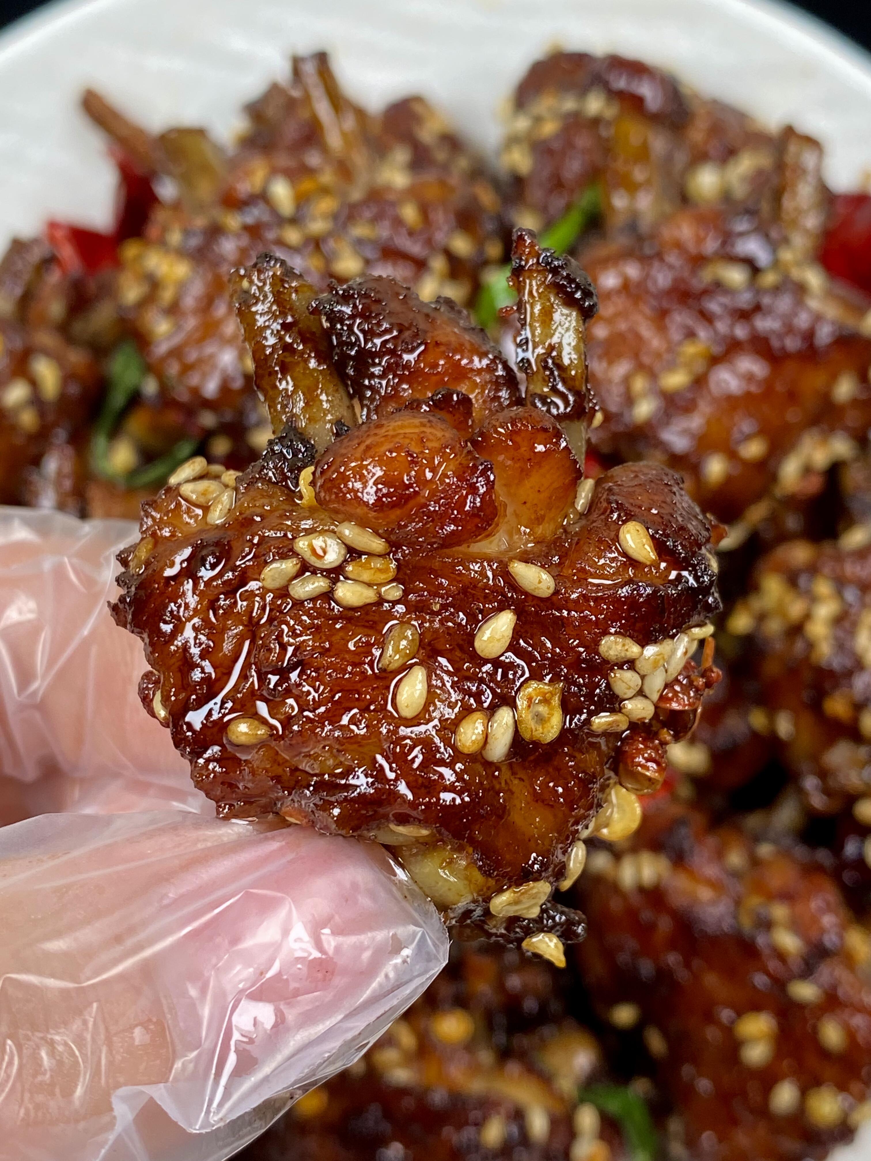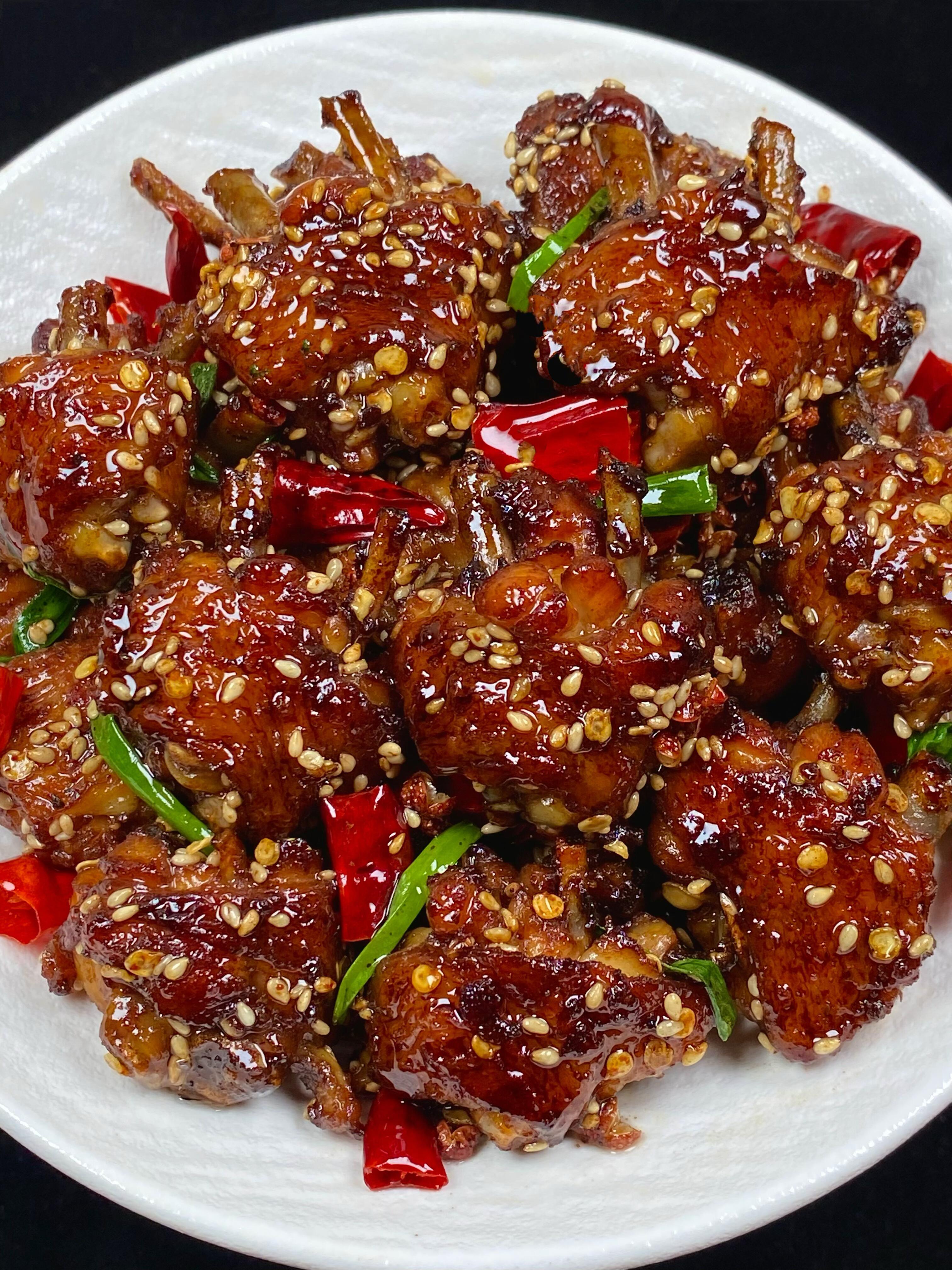 接下来就是关键的煎制环节,冷锅冷油放入鸡翅,中小火慢慢煎,先煎一面至金黄再翻面,把两面都煎得焦香四溢,盛出来备用。锅里留少许底油,放入蒜末、干辣椒和花椒,小火炒出香味,这里要注意火候别太大,不然花椒和辣椒容易炒糊发苦。炒出红油后倒入煎好的鸡翅,快速翻炒均匀,让每块鸡翅都裹上香料的香气,然后加2勺生抽提鲜、半勺白糖中和辣味,再倒入小半碗清水,盖上锅盖焖3分钟,让鸡翅充分吸收汤汁的味道。最后开盖大火收汁,汤汁变得浓稠裹在鸡翅上就可以关火,撒上白芝麻和葱花,香喷喷的家常麻辣鸡翅就做好啦!